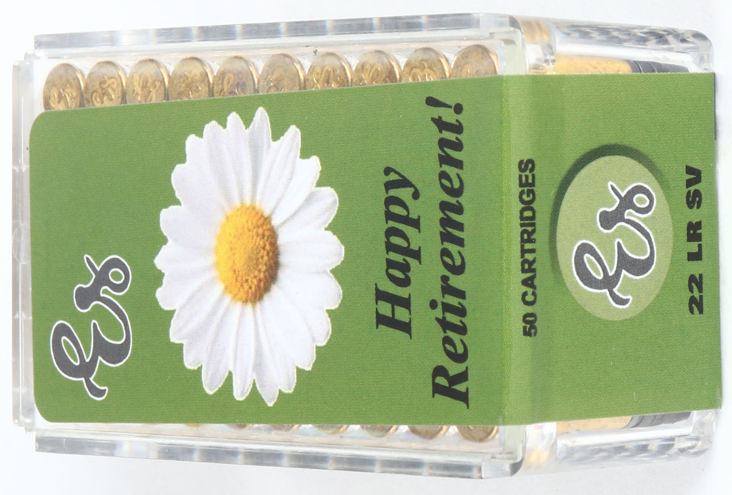 CCi, Es Retirement Commemorative box, .22 Long Rifle, Standard Velocity, FULL & SEALED, 2pc. Clear plastic box with green sealing label featuring a daisy, box is MINT with mint color, label is mint, ammo appears mint. Grade: MINT - Value: 50 to 150