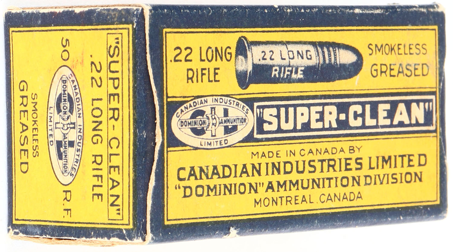 C.I.L., Super-Clean, .22 Long Rifle, Smokeless Greased, RHWeb: CIL-2 LR-1c, Full, 1pc. Yellow & blue box, box is solid with excellent color, very minor age soiling, very minor edge & corner wear, end flaps are solid, ammo is very good. Grade: Excellent + - Value: 8 to 40