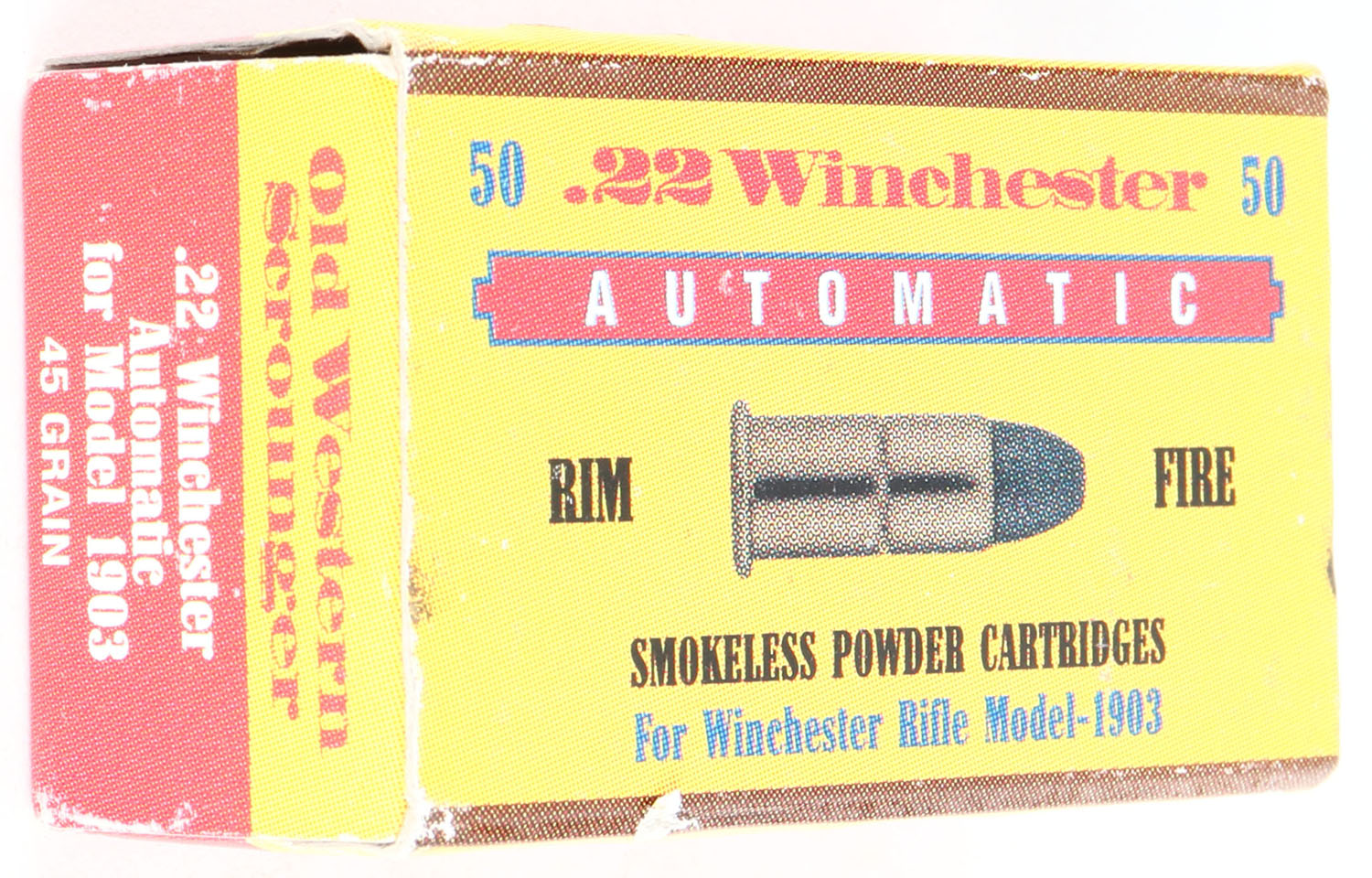 Old Western Scrounger, .22 Winchester Automatic, RHWeb: IT-10 WA-1, Full, 1pc. Yellow & red box, box is near mint with mint color, only very minor edge wear, corners are mostly sharp, end flaps are solid, ammo is excellent. Grade: Excellent ++ - Value: 20 to 40