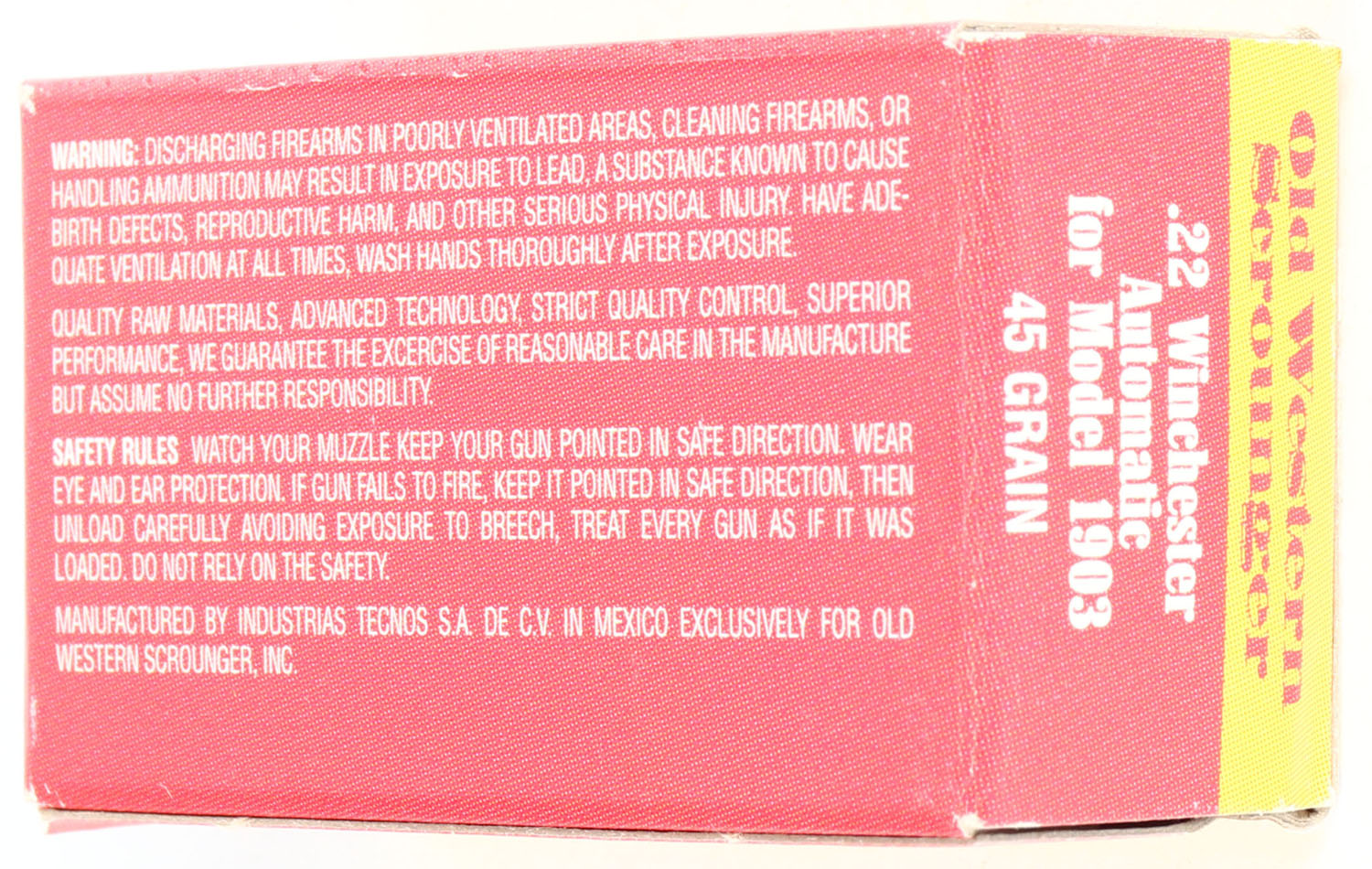 Old Western Scrounger, .22 Winchester Automatic, RHWeb: IT-10 WA-1, Full, 1pc. Yellow & red box, box is solid with minty color, has a crease across the top, very minor edge wear, corners are mostly sharp, end flaps are solid, ammo is mint. Grade: Excellent + - Value: 20 to 40