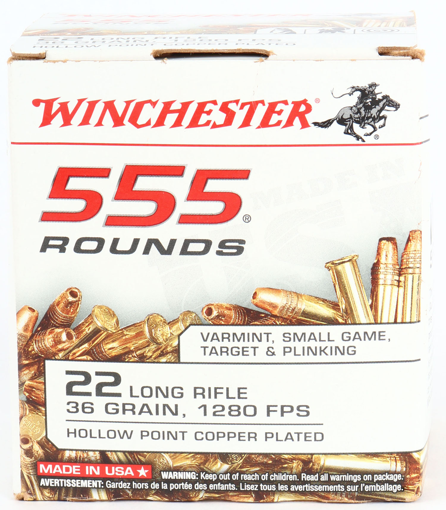 Winchester, .22 Long Rifle Hollow Point, 36 Grain Copper Plated, 1280 FPS, Full, 555rds., 1pc. White & red bulk box, box is solid with mint color, very minor edge & corner wear, top flap is solid, ammo is mint. Grade: Excellent ++ - Value: 30 to 60