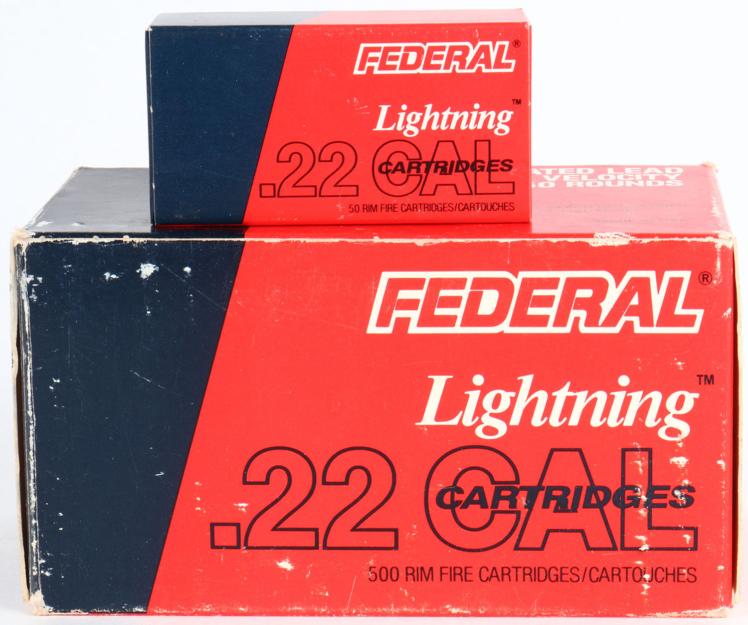 Federal, Lightning, .22 Long Rifle, High Velocity, Partial 7 boxes correct (3 American Eagle), 1pc. Red black & white brick, brick is solid with excellent color, some shelf & corner wear, minor edge wear, end flaps are solid, inside boxes are mint. Grade: Very Good ++ - Value: 20 to 60