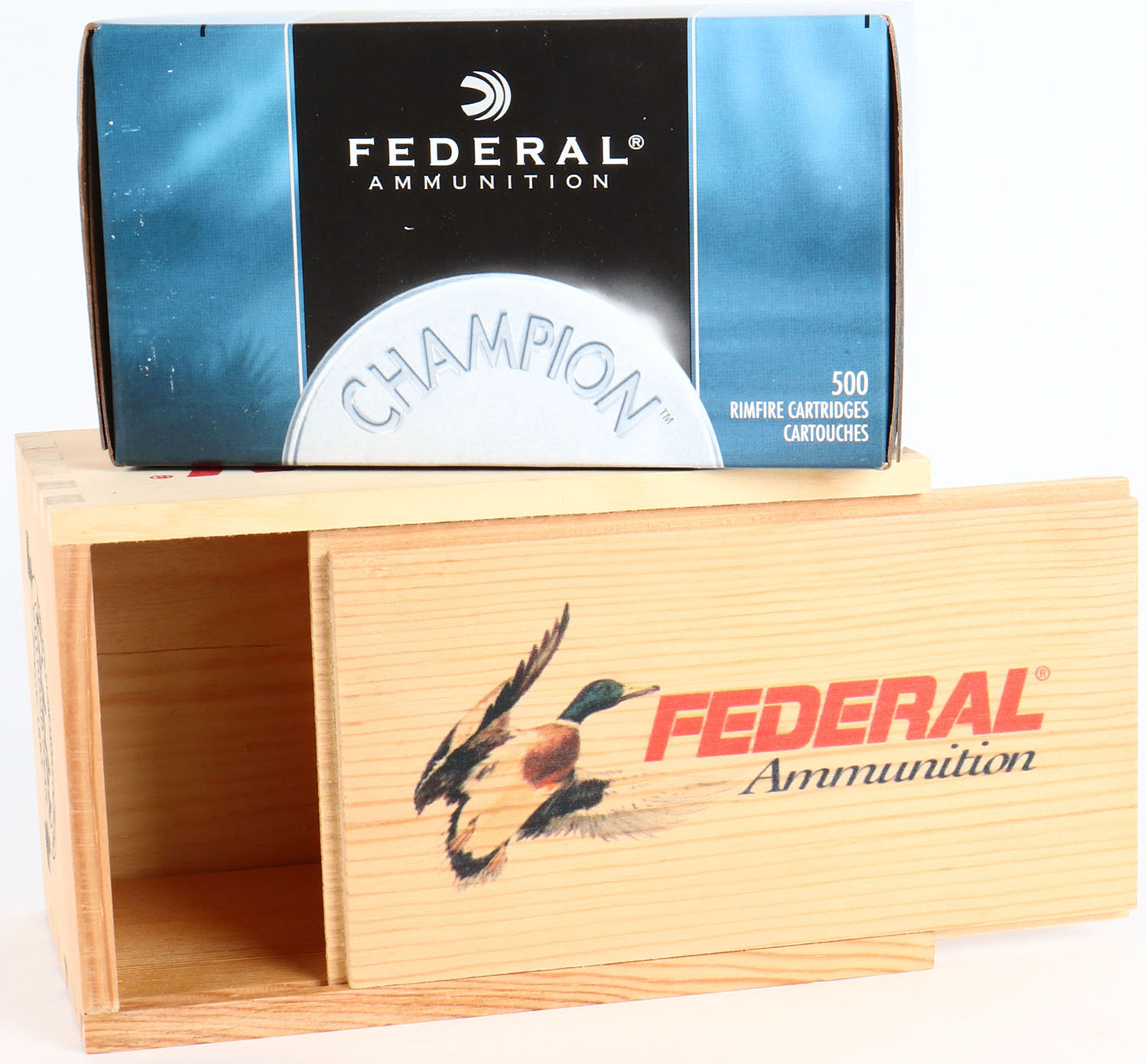 Federal, Champion, .22 Long Rifle, 40 Grain Solid Point, 1240 FPS, FULL & SEALED, 500rds. 1pc. Blue brick inside wood cabalas box, box is mint, brick is mint. Grade: MINT - Value: 20 to 60