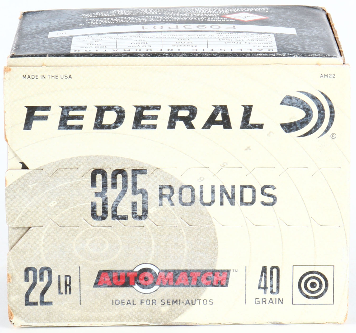 Federal, AutoMatch, .22 Long Rifle, Ideal for Semi-Autos, 40 Grain Solid, 1200 FPS, FULL & SEALED 325 rds. 1pc. Tan & black bulk box, box is solid with minty color, very minor corner wear, edges are crisp. Grade: Excellent ++ - Value: 20 to 40