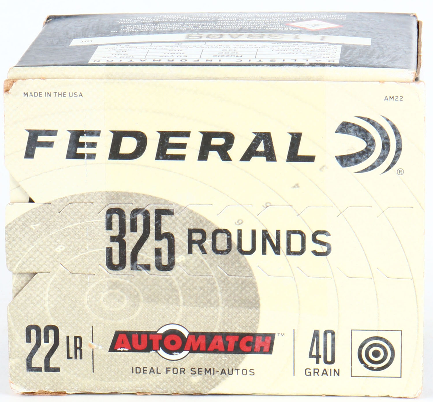 Federal, AutoMatch, .22 Long Rifle, Ideal for Semi-Autos, 40 Grain Solid, 1200 FPS, FULL & SEALED 325 rds. 1pc. Tan & black bulk box, box is solid with minty color, very minor corner wear, edges are crisp. Grade: Excellent ++ - Value: 20 to 40