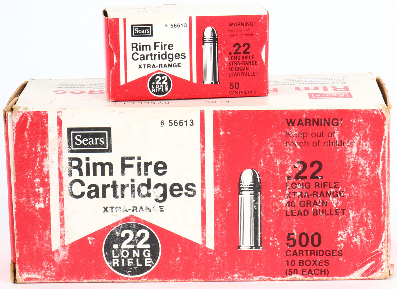 Sears, Rim Fire Cartridges, .22 Long Rifle, Xtra-Range, Full 500rds., 1pc. Red white & black brick, brick is solid with very good color, some age soiling, shelf wear, corner wear, minor edge wear, end flaps are solid, inside boxes are excellent. Grade: Very Good ++ - Value: 40 to 120
