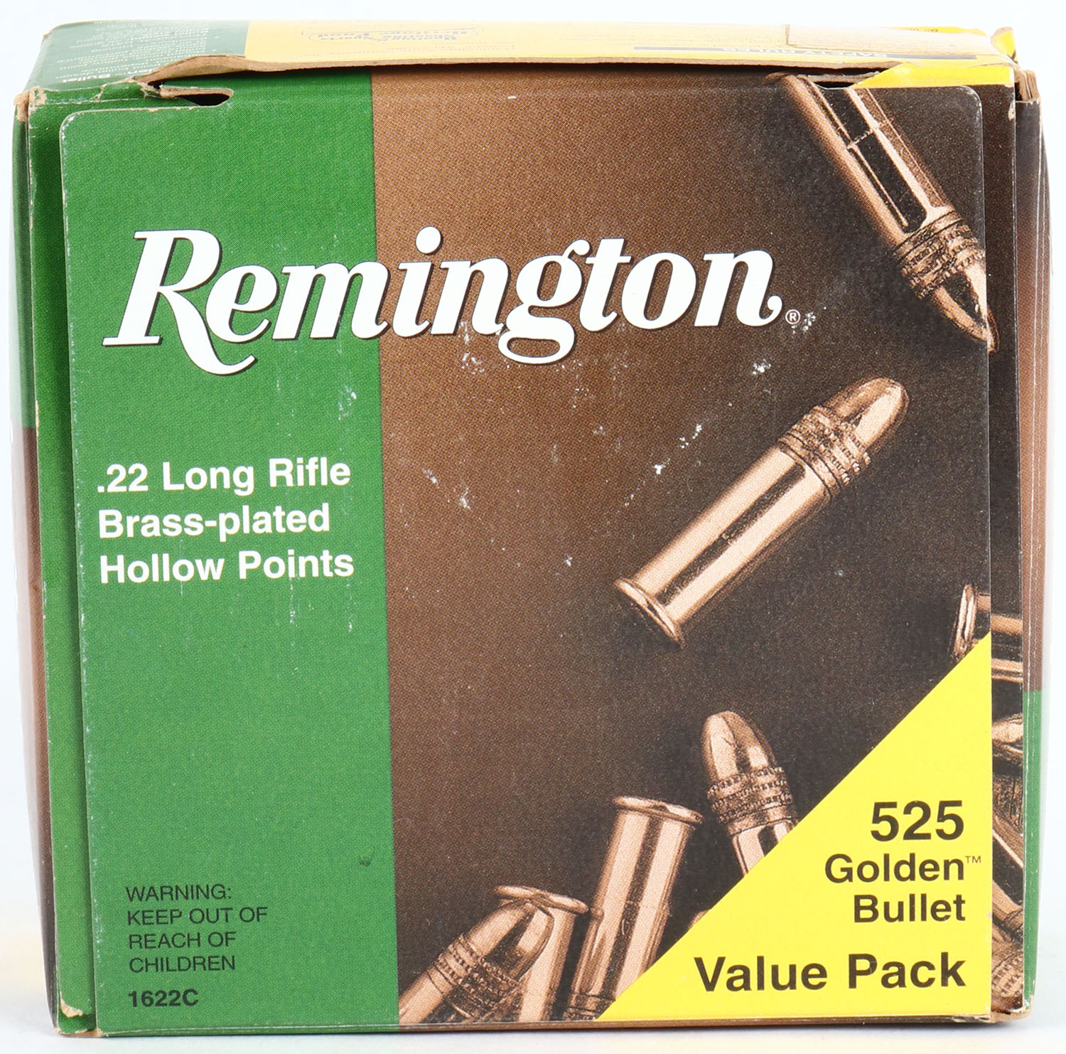 Remington, Golden Bullet Value Pack, .22 Long Rifle Hollow Point, Brass Plated, Full 525rds. 1pc. Green & yellow bulk box, box is solid with minty color, very minor corner wear, edges are crisp, top flap is solid, ammo is minty. Grade: Excellent ++ - Value: 20 to 60