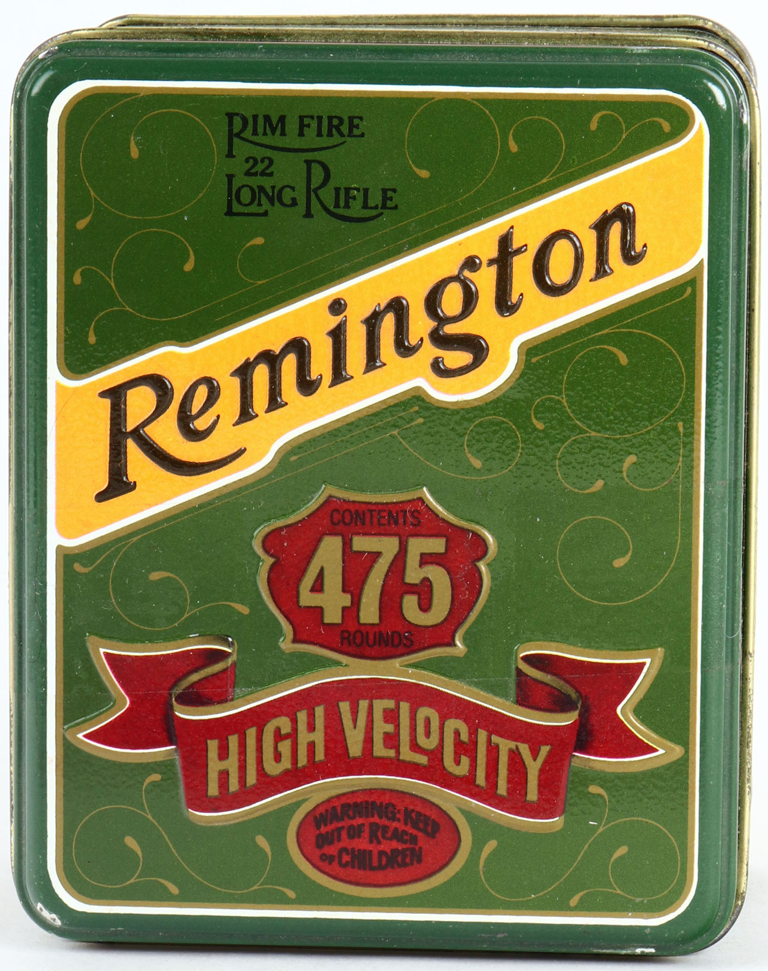 Remington, Kleanbore, .22 Long Rifle, High Velocity, 2pc. Full, 475rds. Collectors tin, pictures a factory on one side, green, red, yellow, black tin, color is minty, tape residue on lid and sides, ammo is excellent. Grade: Excellent - Value: 20 to 60