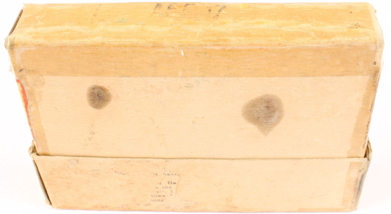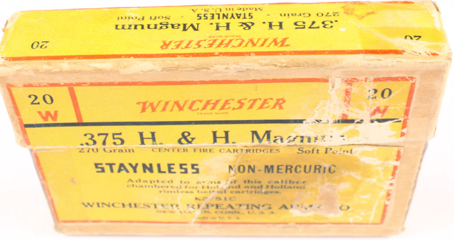 Winchester, Staynless - Non-Mercuric, .375 H&H Magnum, 270 Grain Soft Point, Full, 2pc. Buff box with yellow black & red labels, box is solid with very good color, minor age soiling, some shelf wear, large stain on front, tape on several seams, some corner & edge wear, labels are intact, ammo is very good. Grade: Very Good - Value: 30 to 120