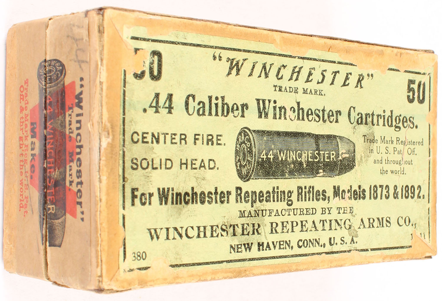 Winchester, .44 Winchester Center Fire, Solid Head, Partial 18rds. Correct, 2pc. Buff box with green top & buff side sealing label, box is solid with very good to excellent color, some age soiling, minor shelf wear, corner wear, some edge wear, labels are intact, left end has been written on, ammo is excellent. Grade: Very Good ++ - Value: 20 to 80