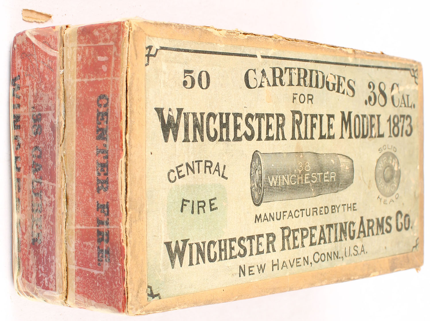 Winchester, .38 Winchester Center Fire, Solid Head, Full, 2pc. Buff box with green top & red side sealing labels, box is solid with good color, some age soiling & color fading, some shelf wear, some edge & corner wear, seam splits on left and back edge of lid, box is 70% covered in tape, labels are intact, ammo is very good to excellent. Grade: Very Good - Value: 40 to 120