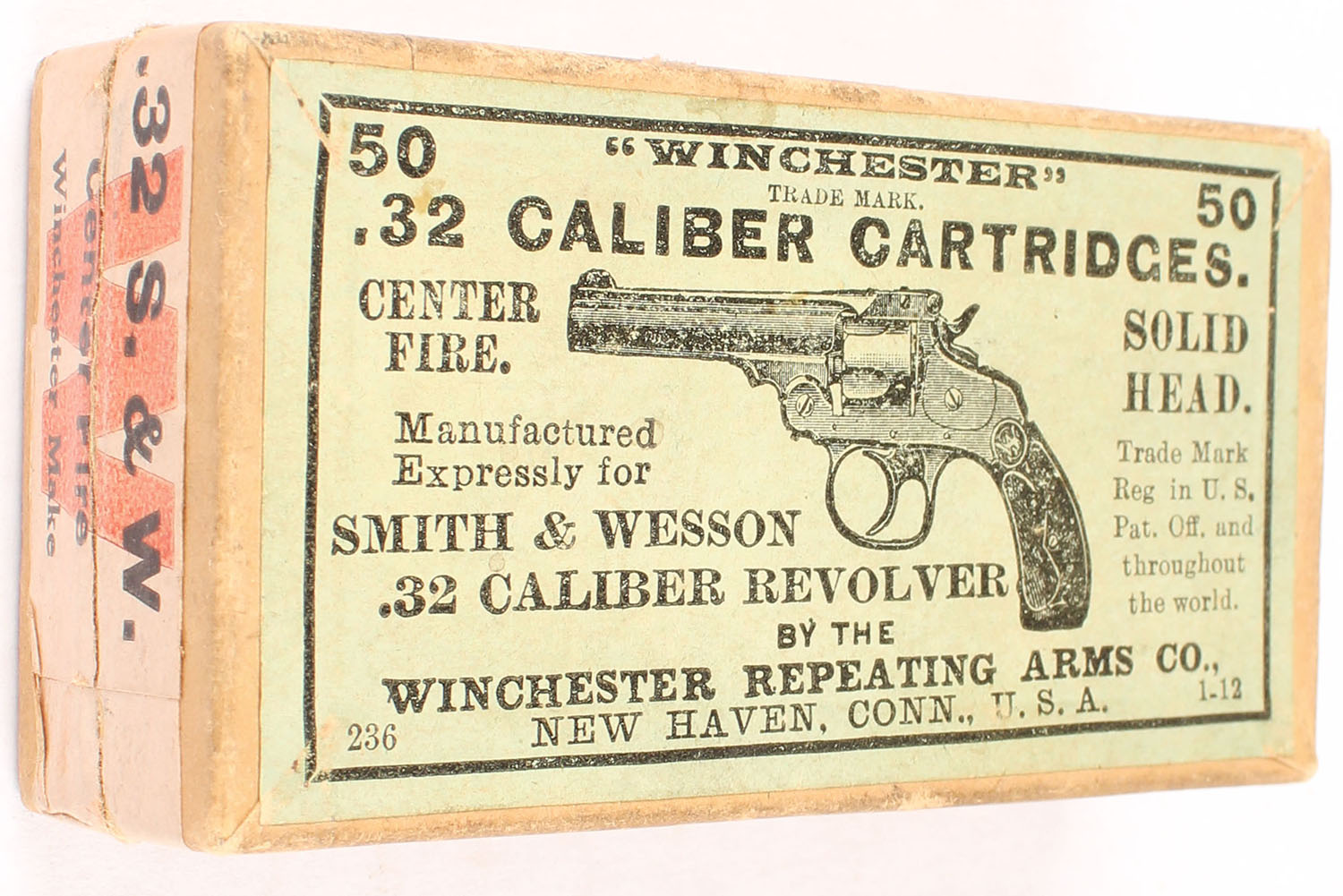 Winchester, .32 Caliber Cartridges, Center Fire, Solid Head, Full, 2pc. Buff box with green top & orange side sealing labels, box is solid with excellent color, orange is faded, some age soiling, edges are crisp, corners are mostly sharp, labels are intact, ammo is good to very good. (658) Grade: Excellent + - Value: 30 to 90