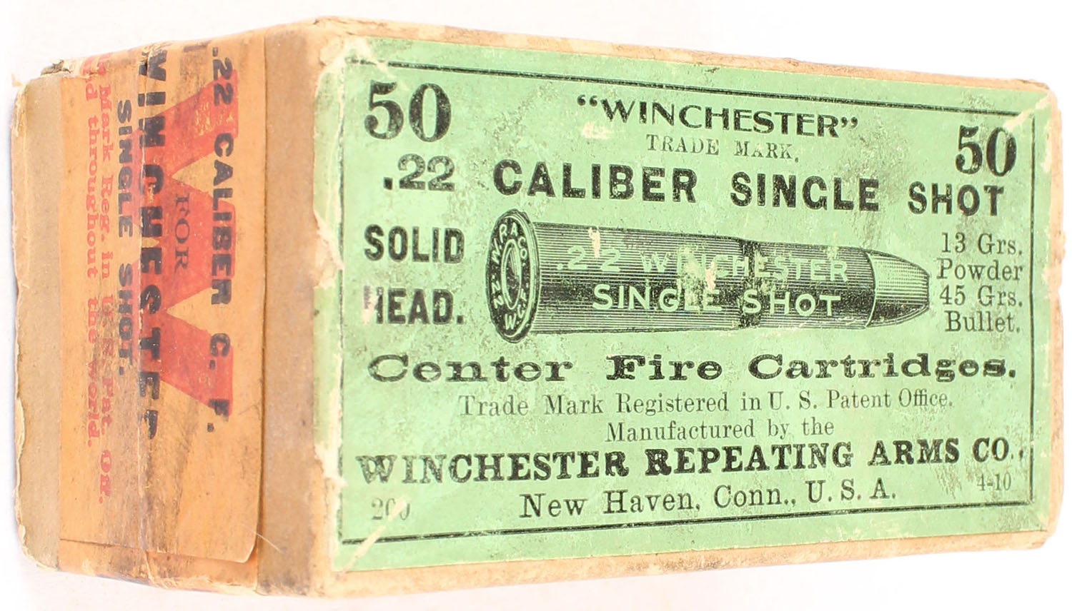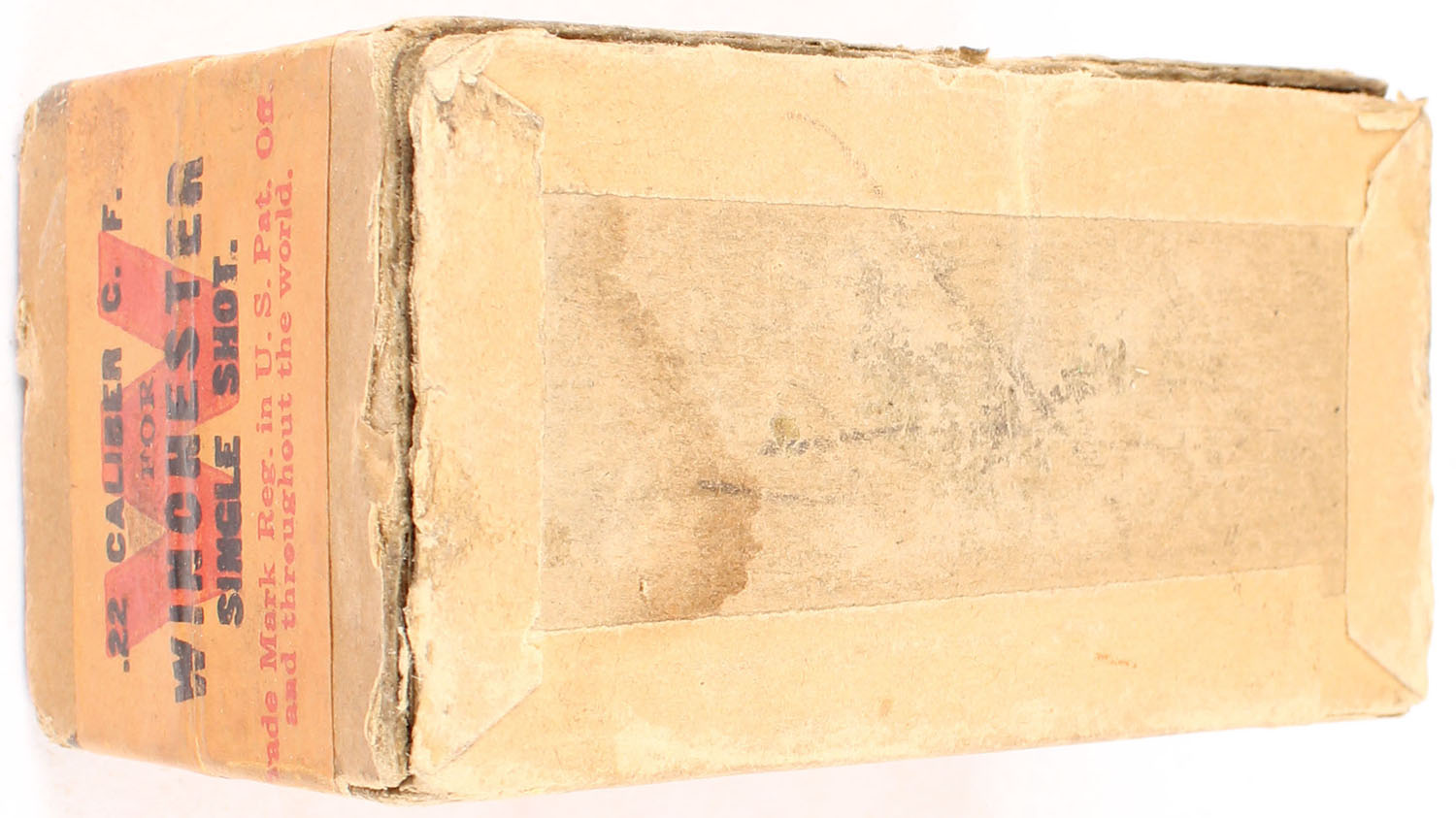Winchester, .22 Winchester Center Fire, Solid Head, 13 Grs Powder, 45 Grs. Bullet, Partial 42rds., 2pc. Buff box with green top & orange side sealing labels, box is solid with very good color, some age soiling & shelf wear, minor edge & corner wear, partial seam split to top right edge of lid, seam splits to 3 bottom edges so that the box opens, labels are intact, ammo is very good to excellent. Grade: Good ++ - Value: 40 to 120