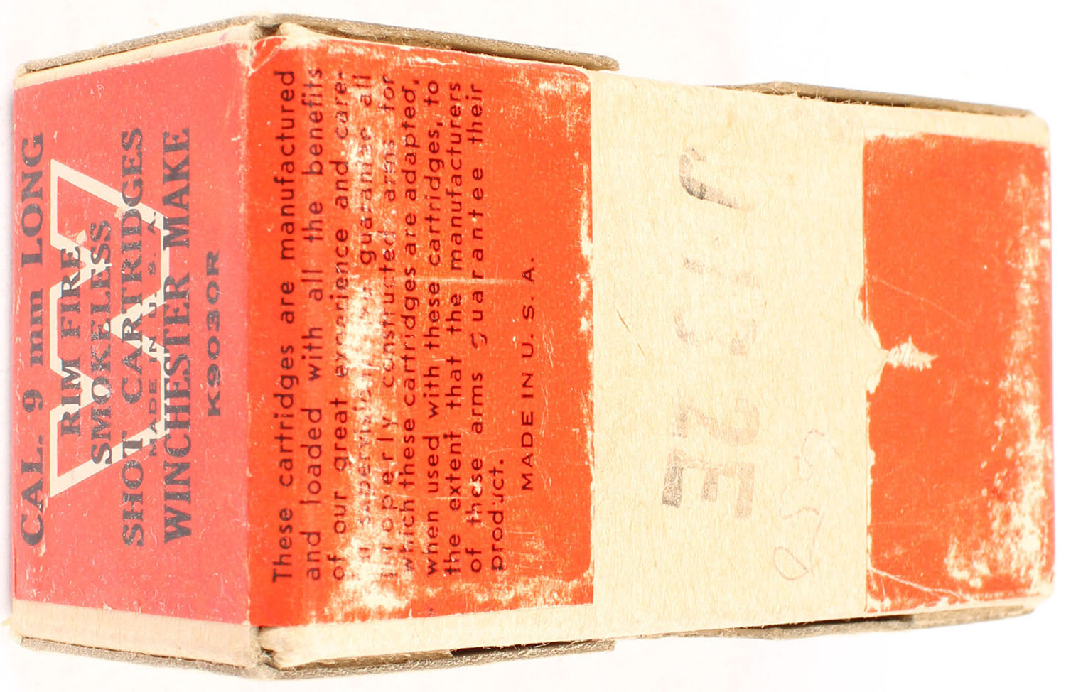 Winchester, 9mm Long Shot Cartridges, Rim Fire, FULL & SEALED, 2pc. Buff box with red wraparound label, box is solid with excellent to minty color, very minor color fading & shelf wear, very minor corner wear, edges are crisp, label is intact. Grade: Excellent ++ - Value: 200 to 600