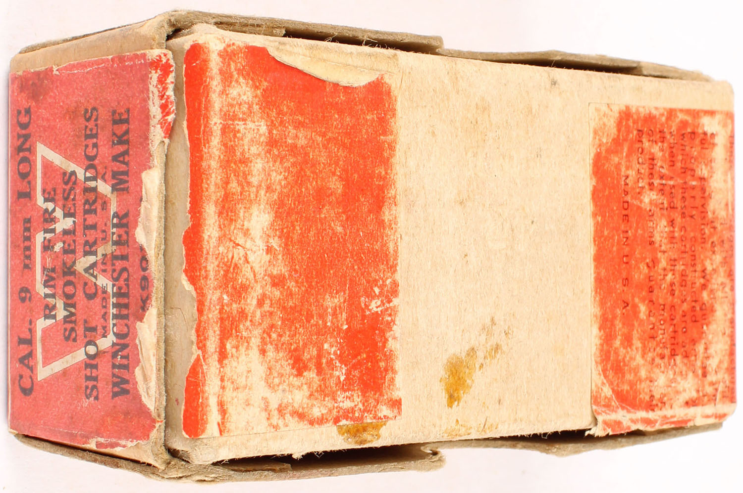 Winchester, 9mm Long Shot Cartridges, Rim Fire, FULL & SEALED, 2pc. Buff box with red wraparound label, box is solid with very good color, some age soiling shelf wear, minor corner & edge wear, label is intact, ammo is excellent. Grade: Very Good ++ - Value: 100 to 400