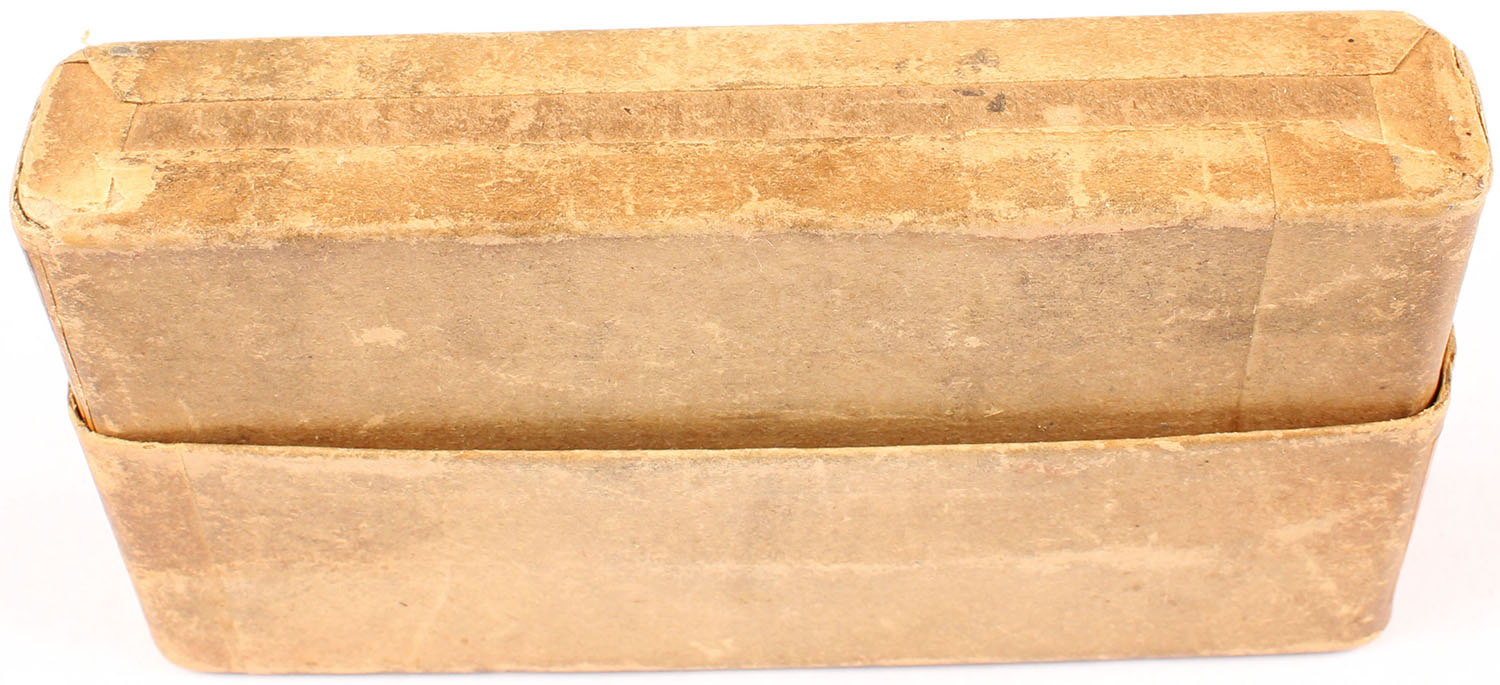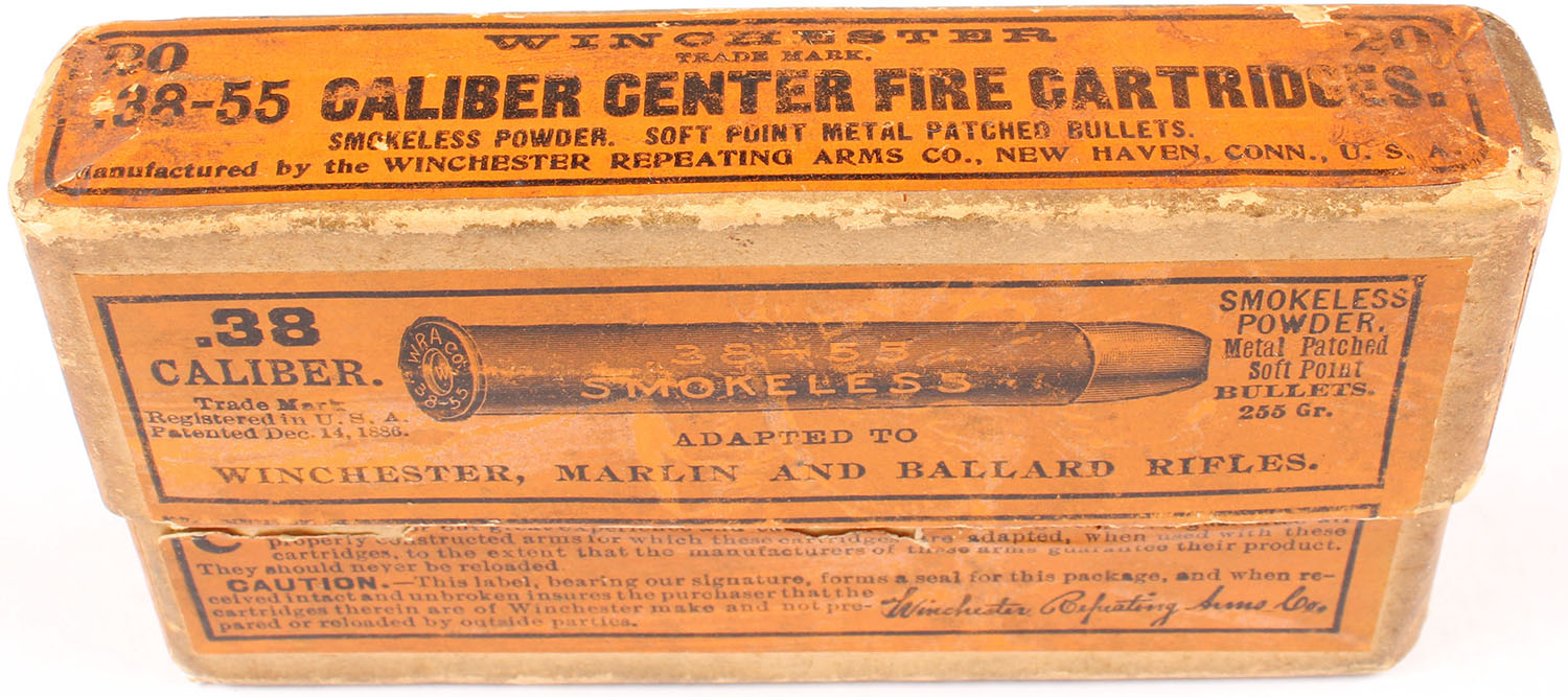 Winchester, .38-55, Smokeless Powder, 255 Gr. Metal Patched Soft Point Bullets, Full, 2pc. Buff box with orange labels, box is solid with very good color, some age soiling, some edge & corner wear, labels are intact, ammo is excellent. Grade: Very Good ++ - Value: 50 to 150