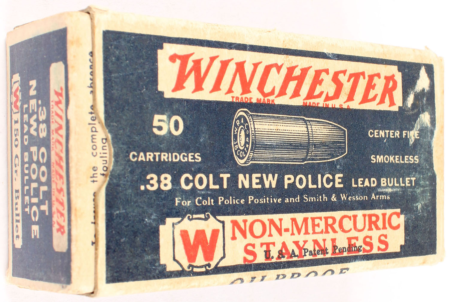 Winchester, Non-Mercuric Staynless, .38 Colt New Police, Oilproof, Full, 1pc. Blue white & red box, box is solid with very good to excellent color, minor age soiling, some shelf wear, very minor corner wear, edges are crisp, end flaps are solid, ammo is excellent. Grade: Excellent - Value: 20 to 60
