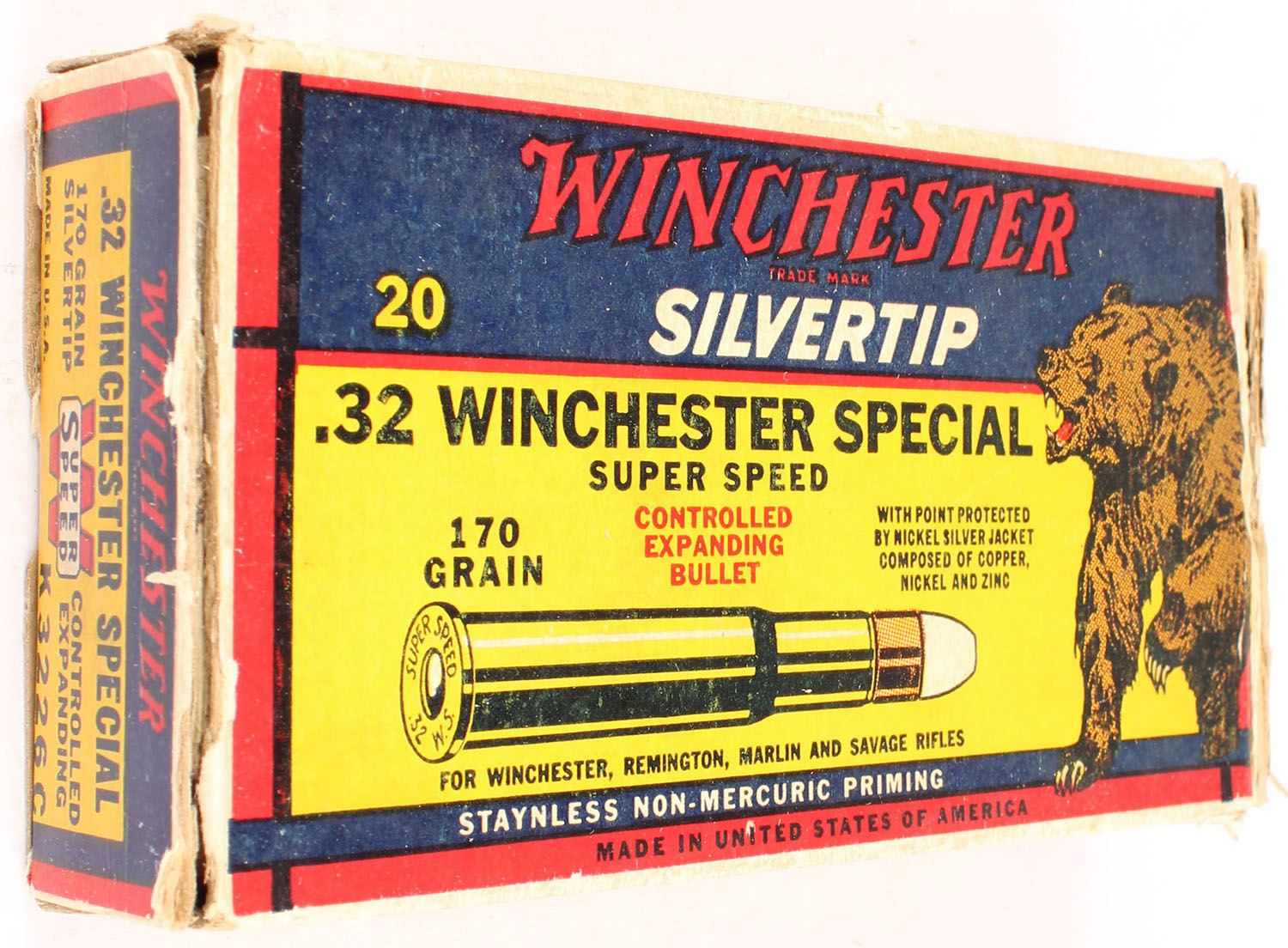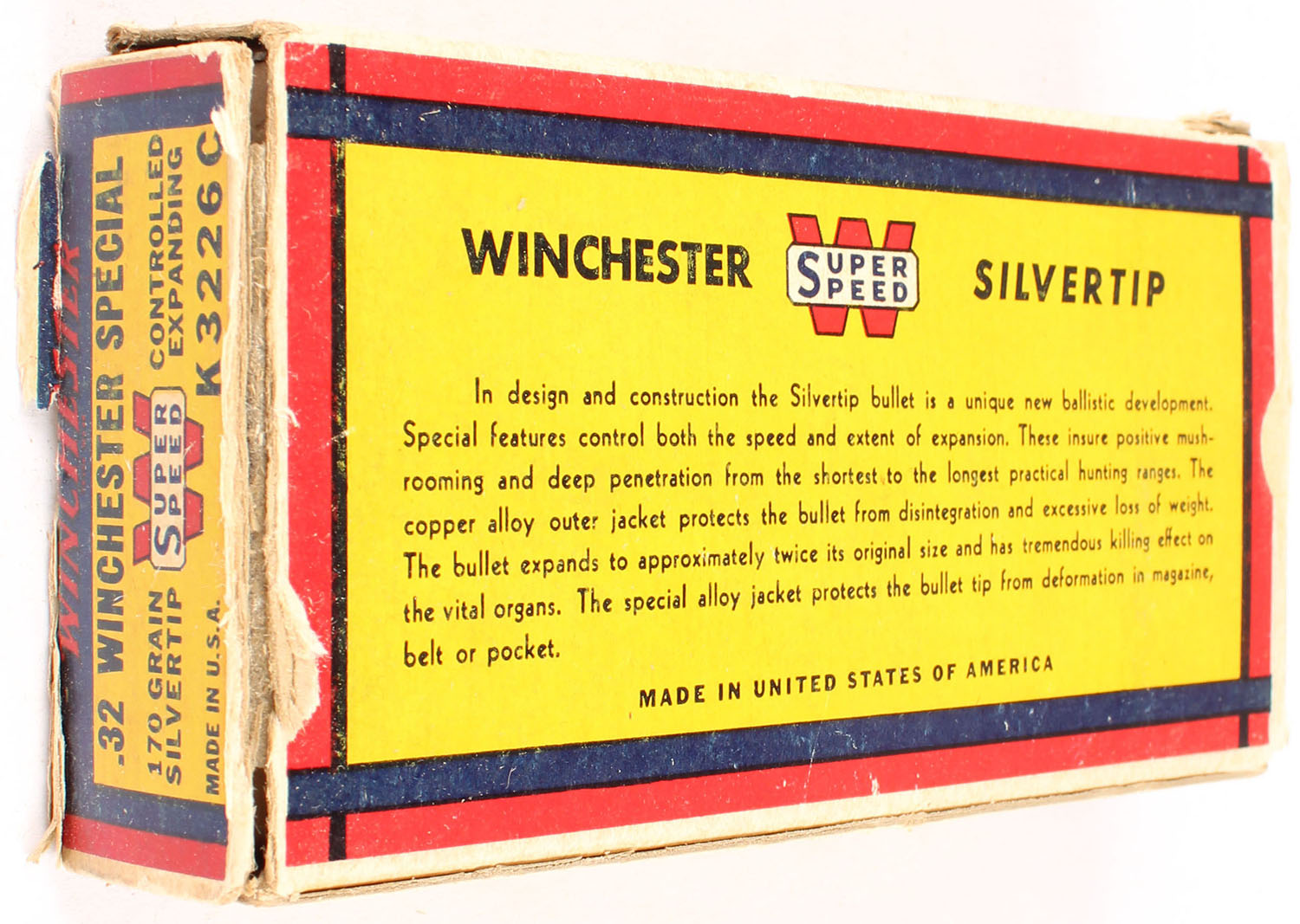 Winchester, Silvertip, .32 Winchester Special, 170 Grain Controlled Expanding Bullet, Full, 1pc. Yellow blue & red bear box, both end flaps are torn and taped, box has excellent color, corner wear, edges are mostly crisp, ammo is excellent. Grade: Very Good ++ - Value: 50 to 150