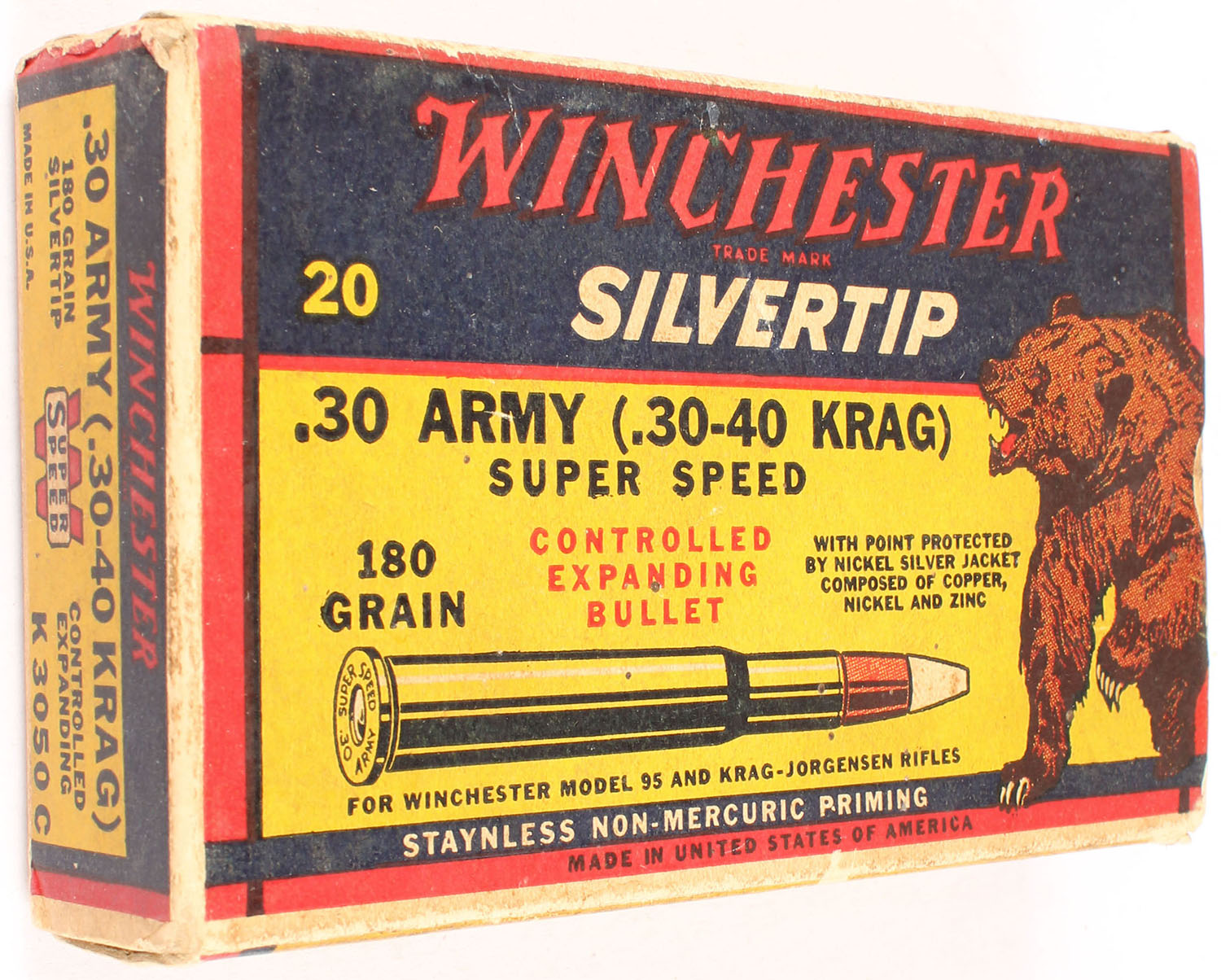 Winchester, Silvertip, .30 Army (.30-40 Krag), 180 Grain Controlled Expanding Bullet, Partial 19rds. Correct, 1pc. Yellow blue & red bear box, box is solid with very good to excellent color, some age soiling, some edge & corner wear, end flaps are solid, ammo is excellent. Grade: Very Good ++ - Value: 30 to 90