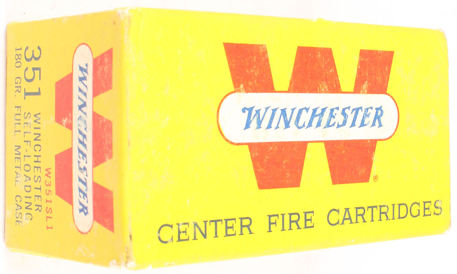 Winchester, .351 Winchester Self-Loading, 180 Grain Full Metal Case, Full, 1pc. Yellow white & red box, box is solid with very good to excellent color, very minor age soiling, some shelf wear, some corner wear, very minor edge wear, end flaps are solid, ammo is excellent. Grade: Excellent - Value: 100 to 250