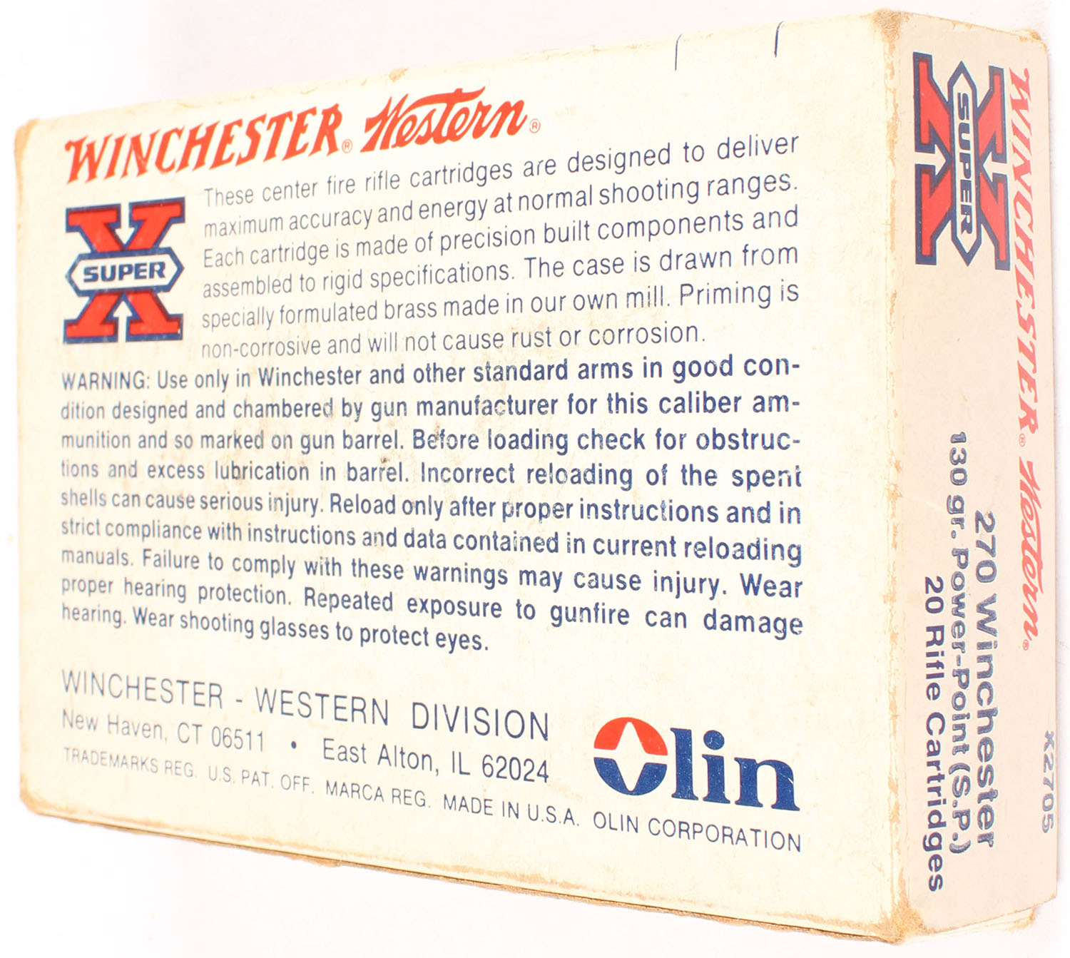 Winchester, Super X, .270 Winchester, 130 Grain Power-Point, Full, 1pc. White red & black box, box is solid with very good to excellent color, some age soiling, minor shelf wear, corner wear, some edge wear, end flaps are solid, ammo is excellent. Grade: Very Good ++ - Value: 20 to 60
