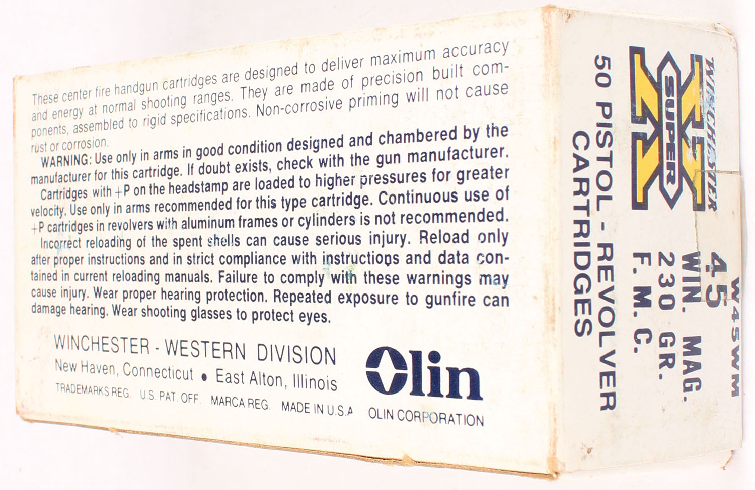 Winchester, Super X, .45 Winchester Magnum, 230 Grain Full Metal Case, Full, 1pc. White orange & blue box, box is solid with excellent color, minor age soiling & corner wear, very minor edge wear, end flaps are solid, tape on both ends, ammo is excellent. Grade: Very Good ++ - Value: 50 to 150