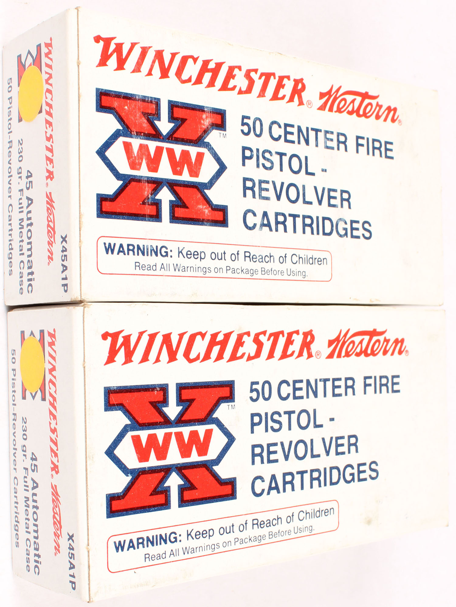 Winchester, Lot of (2), X, .45 Automatic, 230 Grain Full Metal Case, both boxes full with excellent color, some age soiling, corners are sharp, edges are crisp, end flaps are solid, ammo is minty. Grade: Excellent - Value: 30 to 90