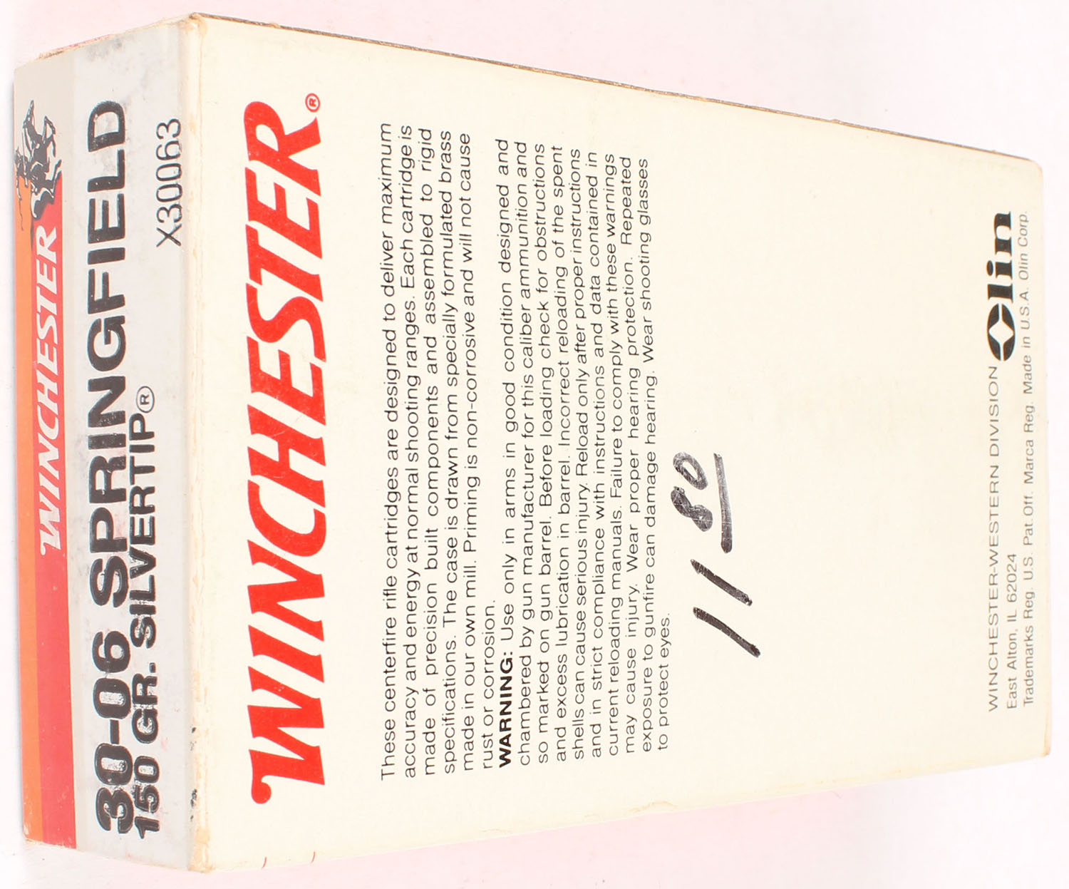 Winchester, Super X, .30-06 Springfield, 110 Grain Silvertip, Partial 12rds. Correct, 1pc. Gray red & orange box, box is solid with excellent color, minor shelf wear, very minor corner wear, edges are crisp, end flaps are solid, ammo is excellent. Grade: Excellent - Value: 10 to 50