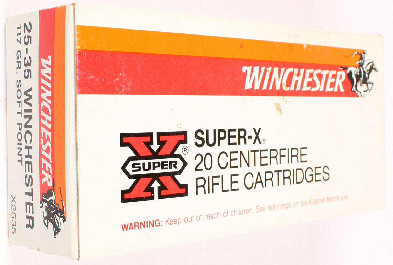 Winchester, Super X, .25-35 Winchester, 117 Grain Soft Point, Full, 1pc. White red & orange box, box is solid with excellent color, some staining on top, corners are mostly sharp, edges are mostly crisp, end flaps are solid, ammo is excellent. Grade: Excellent - Value: 40 to 120