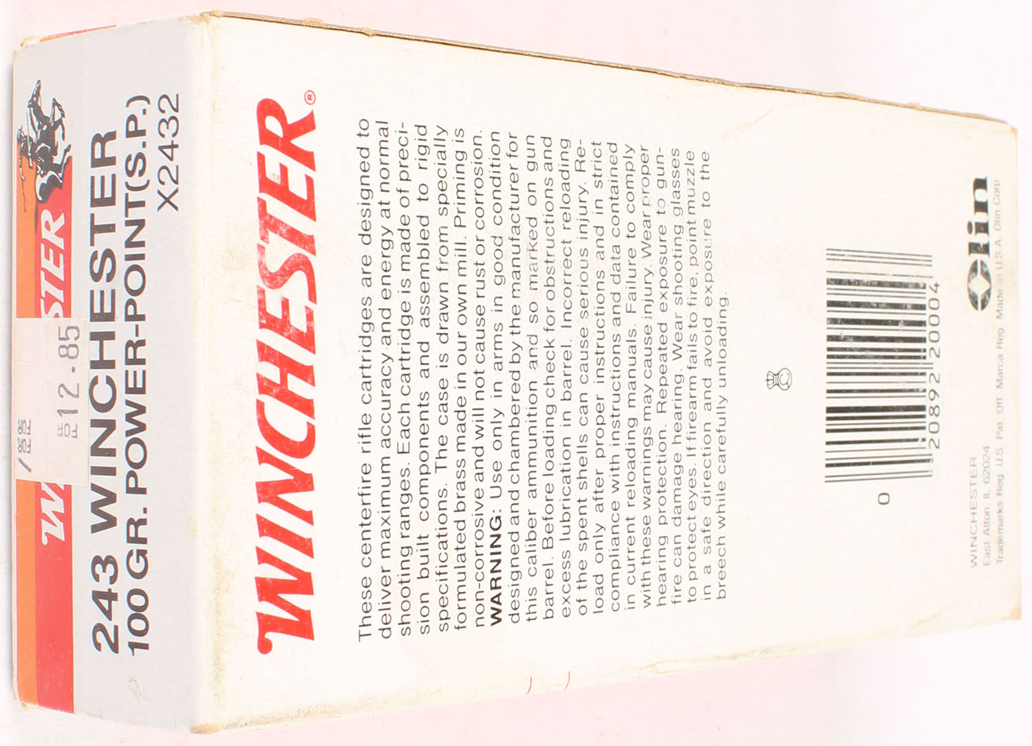 Winchester, Super X, .243 Winchester, 100 Grain Power-Point, Full, 1pc. White red & orange box, box is solid with good to very good color, staining on top, some shelf & corner wear, minor edge wear, end flaps are solid, ammo is excellent. Grade: Very Good + - Value: 20 to 60