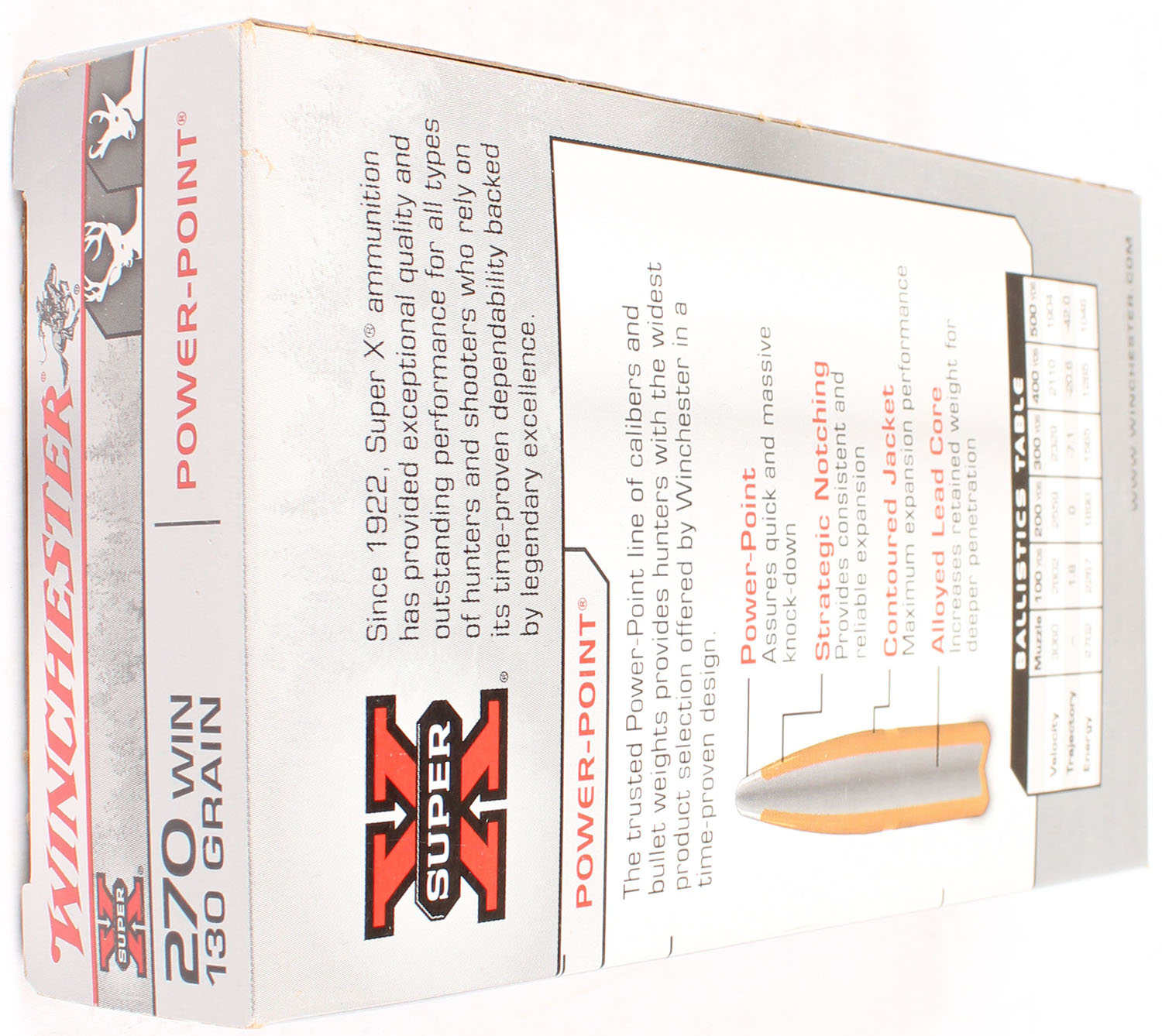 Winchester, Super X, .270 Winchester, 130 Grain Power-Point, Full, 1pc. Gray & red box, box is solid with minty color, very minor corner wear, edges are crisp, end flaps are solid, ammo is minty. Grade: Excellent ++ - Value: 20 to 60