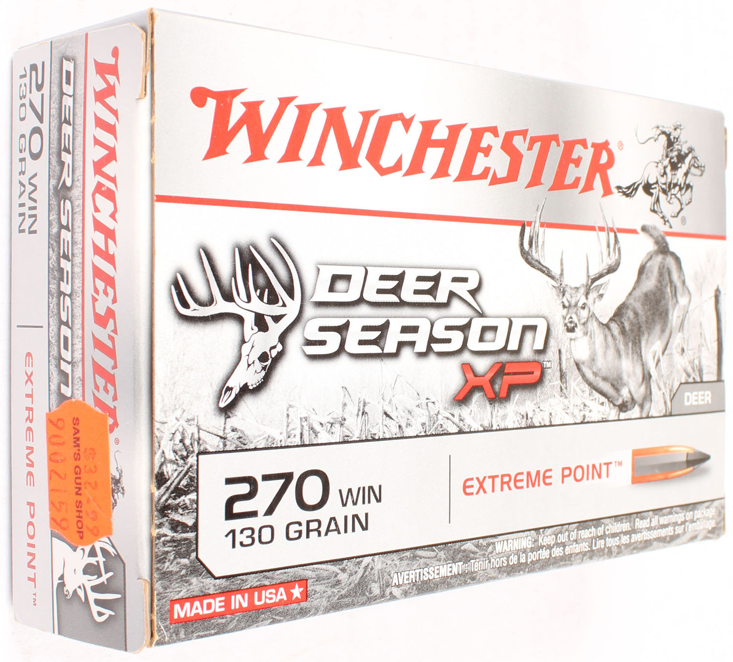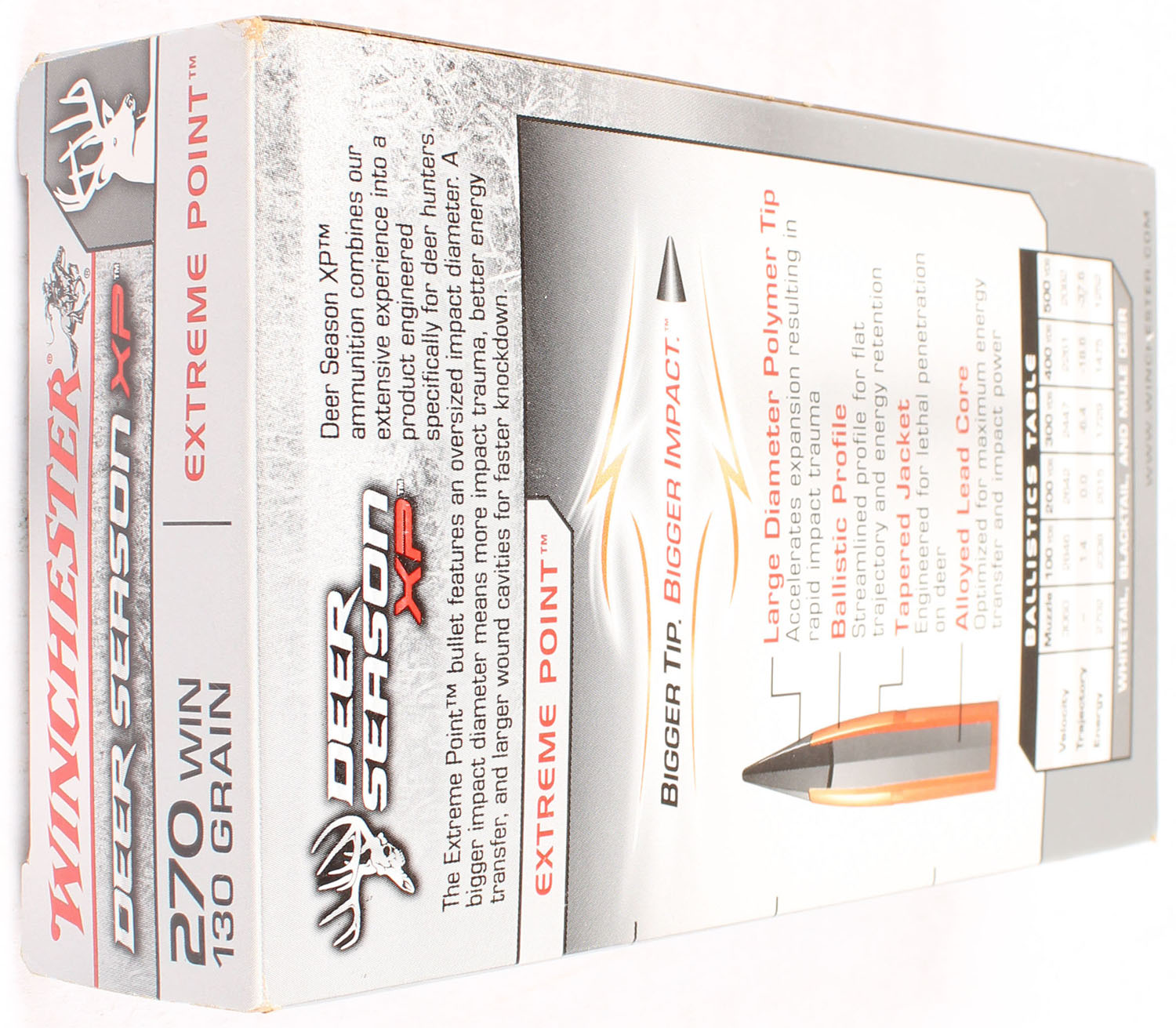 Winchester, Deer Season XP, .270 Winchester, 130 Grain Extreme Point, Full, 1pc. Gray & red box, box is MINT with mint color, corners are sharp, edges are crisp, end flaps are solid, ammo is minty. Grade: MINT - Value: 20 to 60