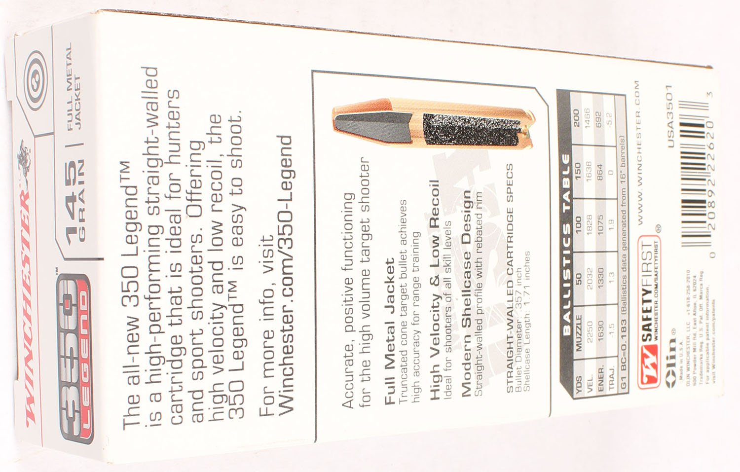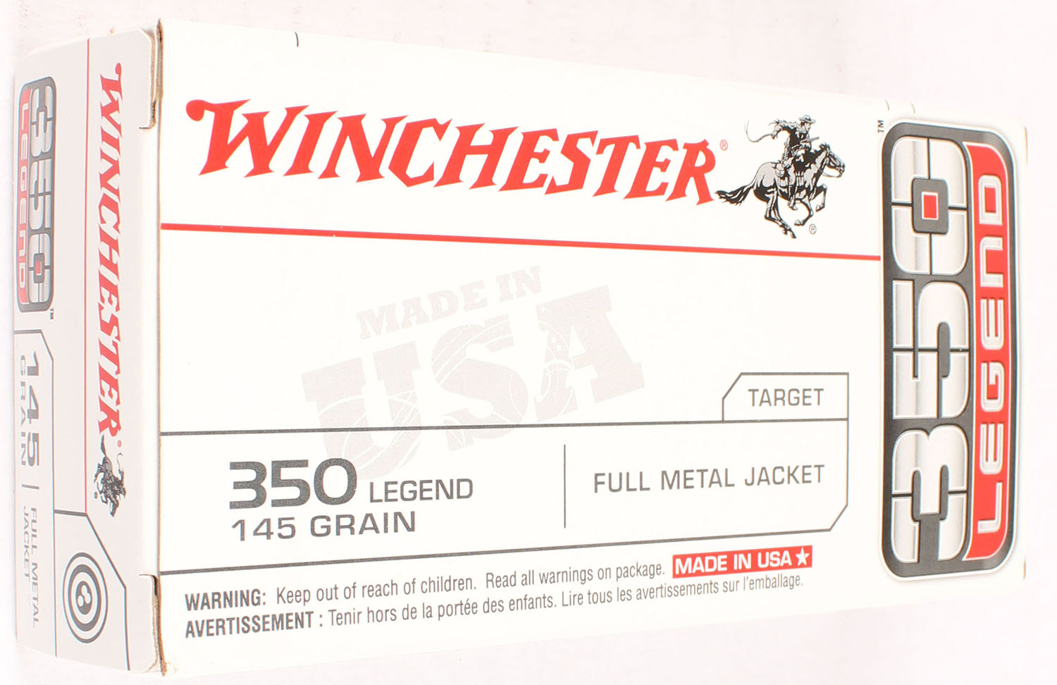 Winchester, Target, .350 Legend, 145 Grain Full Metal Jacket, Full, 1pc. White & red box, box is solid with minty color, very minor corner wear, edges are crisp, end flaps are solid, ammo is minty. Grade: Excellent ++ - Value: 10 to 40