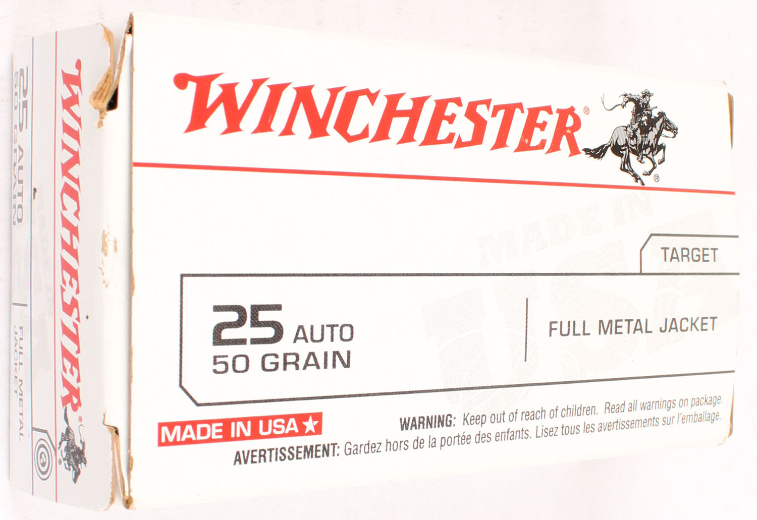 Winchester, Target, .25 Auto., 50 Grain Full Metal Jacket, Full, 1pc. White & red box, box is solid with excellent to minty color, very minor corner wear, edges are crisp, end flaps are solid, ammo is minty. Grade: Excellent ++ - Value: 10 to 40
