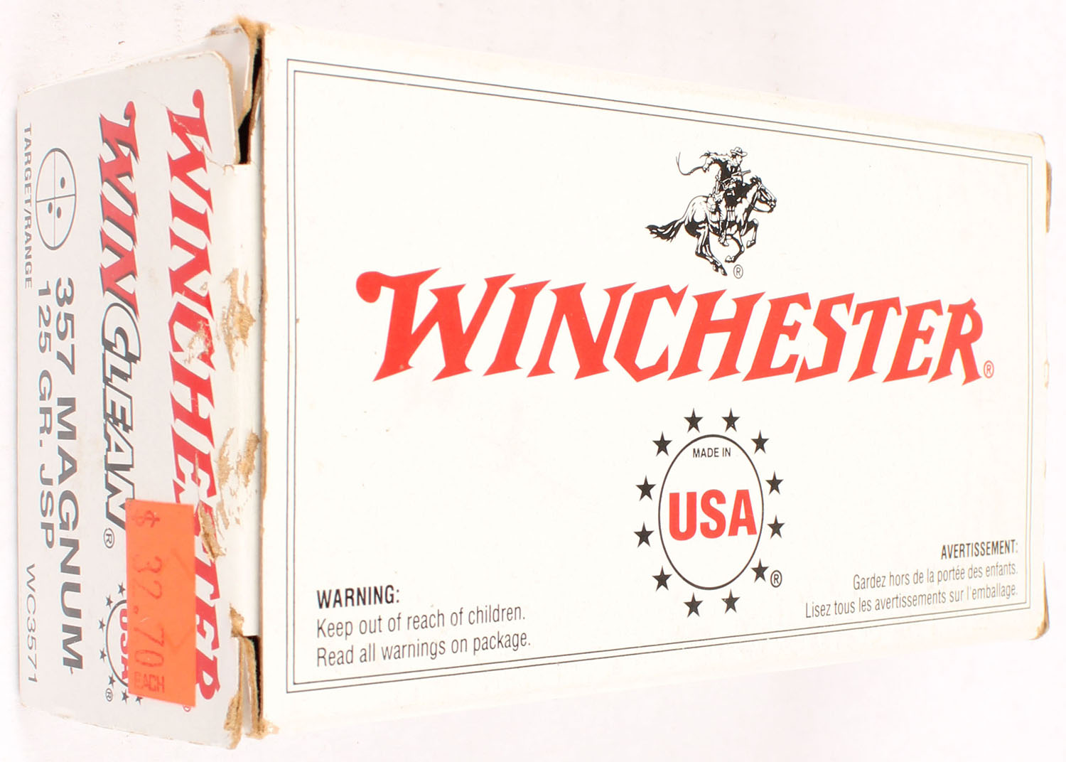 Winchester, WinClean, .357 Magnum, 125 Grain Jacketed Soft Point, Full, 1pc. White & red box, box is solid with excellent color, minor edge & corner wear, end flaps are solid, ammo is minty. Grade: Excellent + - Value: 20 to 60