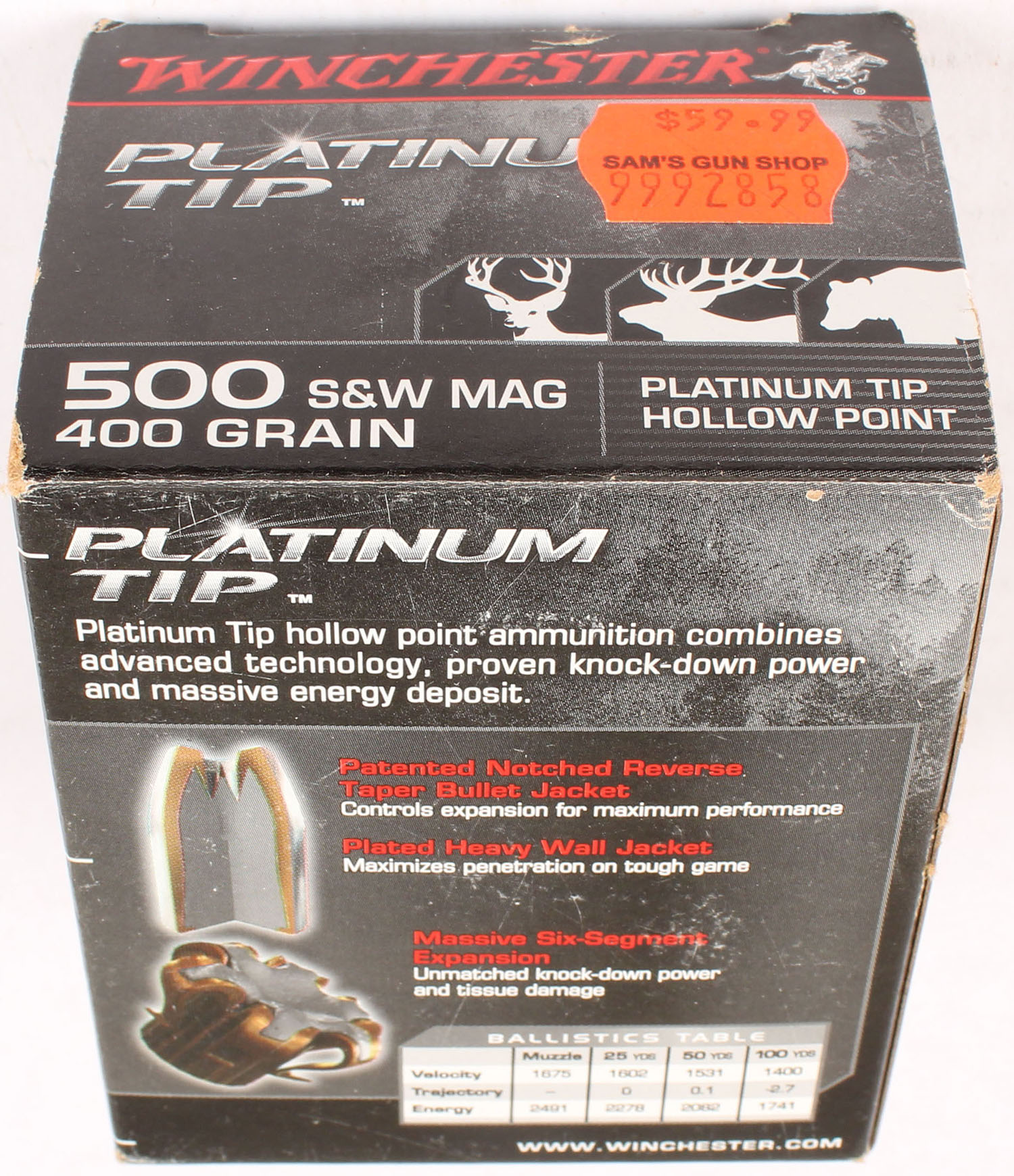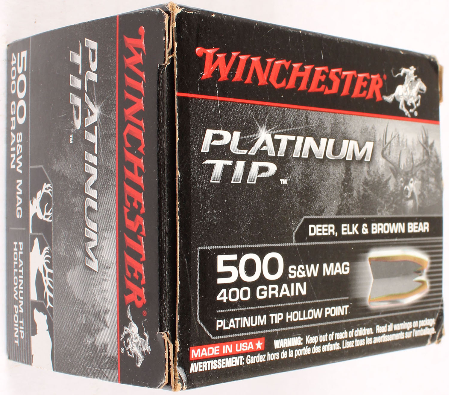 Winchester, Platinum Tip, 500 Smith & Wesson Mag., 400 Grain Platinum Tip Hollow Point, Full, 1pc. Black box, box is solid with minty color, minor corner wear, edges are crisp, end flaps are solid, ammo is minty. Grade: Excellent + - Value: 40 to 80