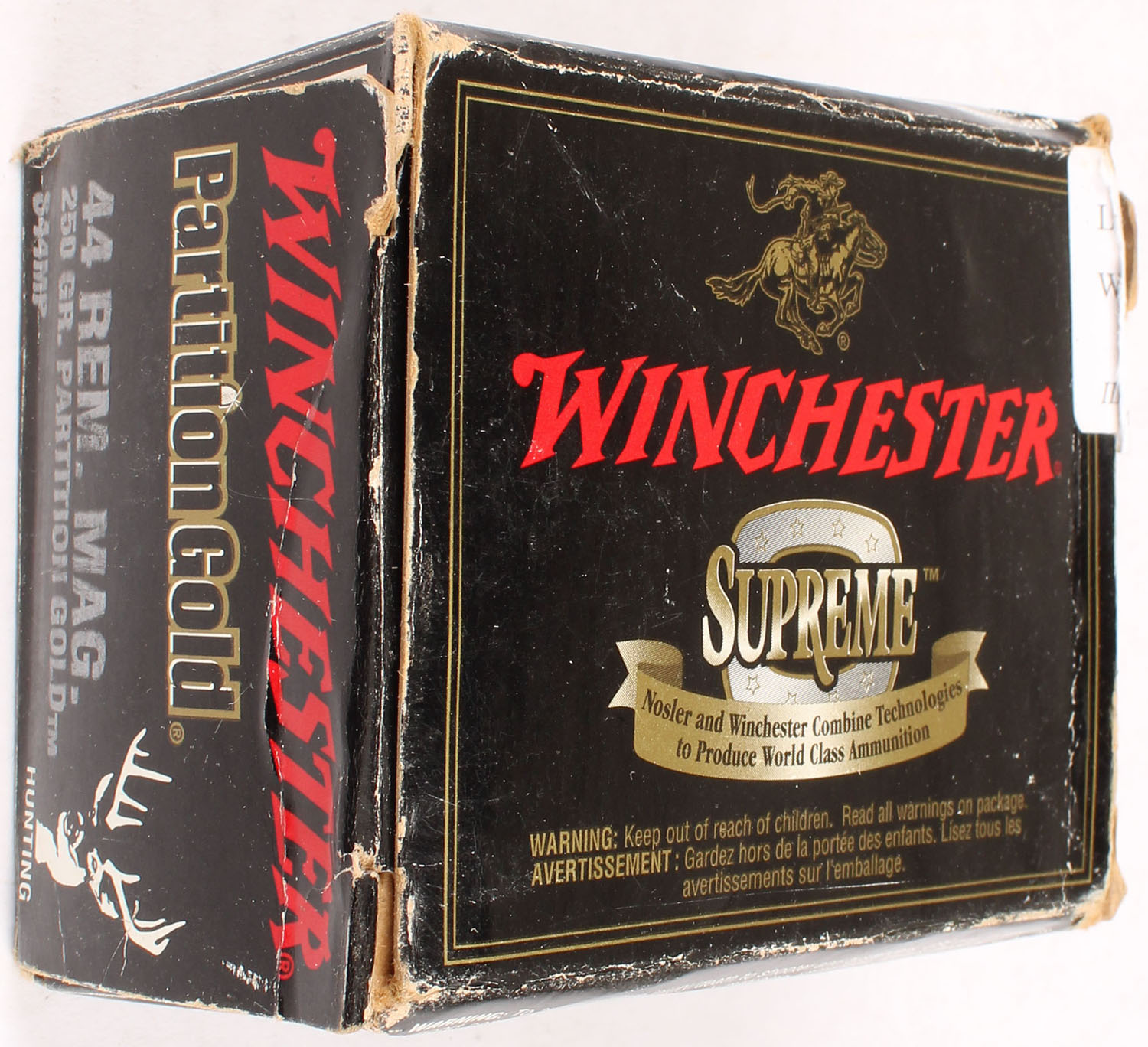 Winchester, Supreme, .44 Rem. Mag., 250 Grain Partition Gold, Partial 18rds. Correct, 1pc. Black box, box is solid with excellent color, edge & corner wear, end flaps are solid, ammo is excellent. Grade: Very Good ++ - Value: 10 to 40