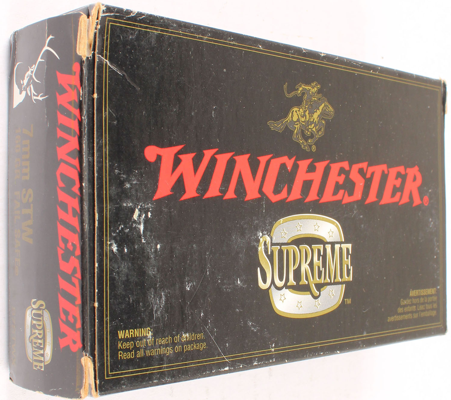 Winchester, Supreme, 7mm STW, 160 Grain Fail Safe, Full, 1pc. Black box, box is solid with excellent color, minor shelf & corner wear, very minor edge wear, end flaps are solid, ammo is minty. Grade: Excellent + - Value: 20 to 60