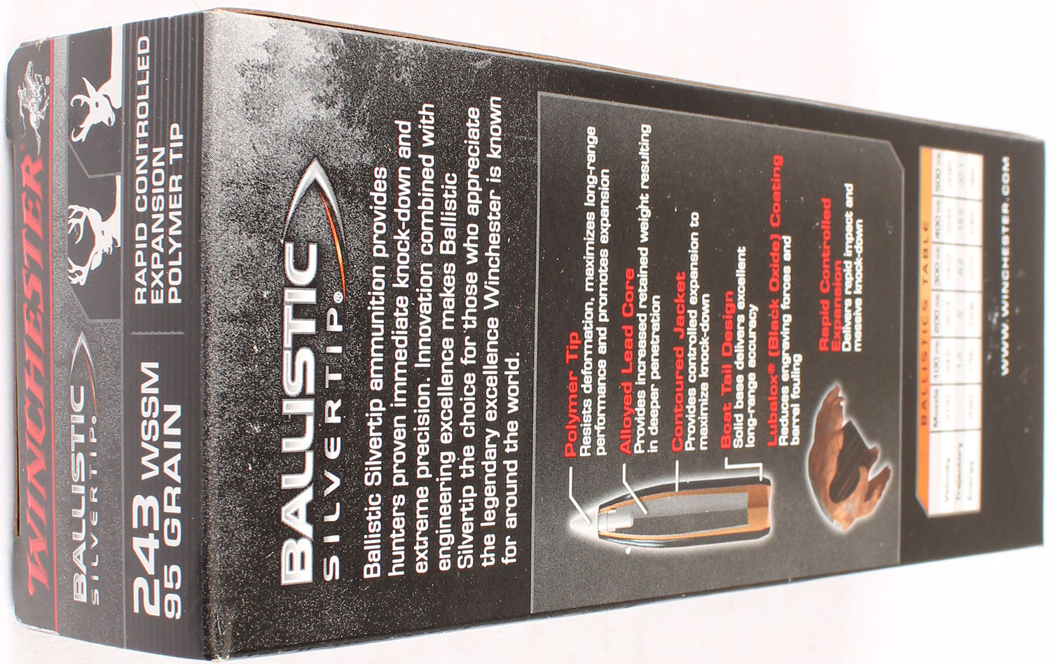 Winchester, Ballistic Silvertip, 243 WSSM, 95 Grain Rapid Controlled Expansion Polymer Tip, Full, 1pc. Black box, box is MINT with minty color, corners are sharp, edges are crisp, end flaps are solid, ammo is minty. Grade: MINT - Value: 20 to 60