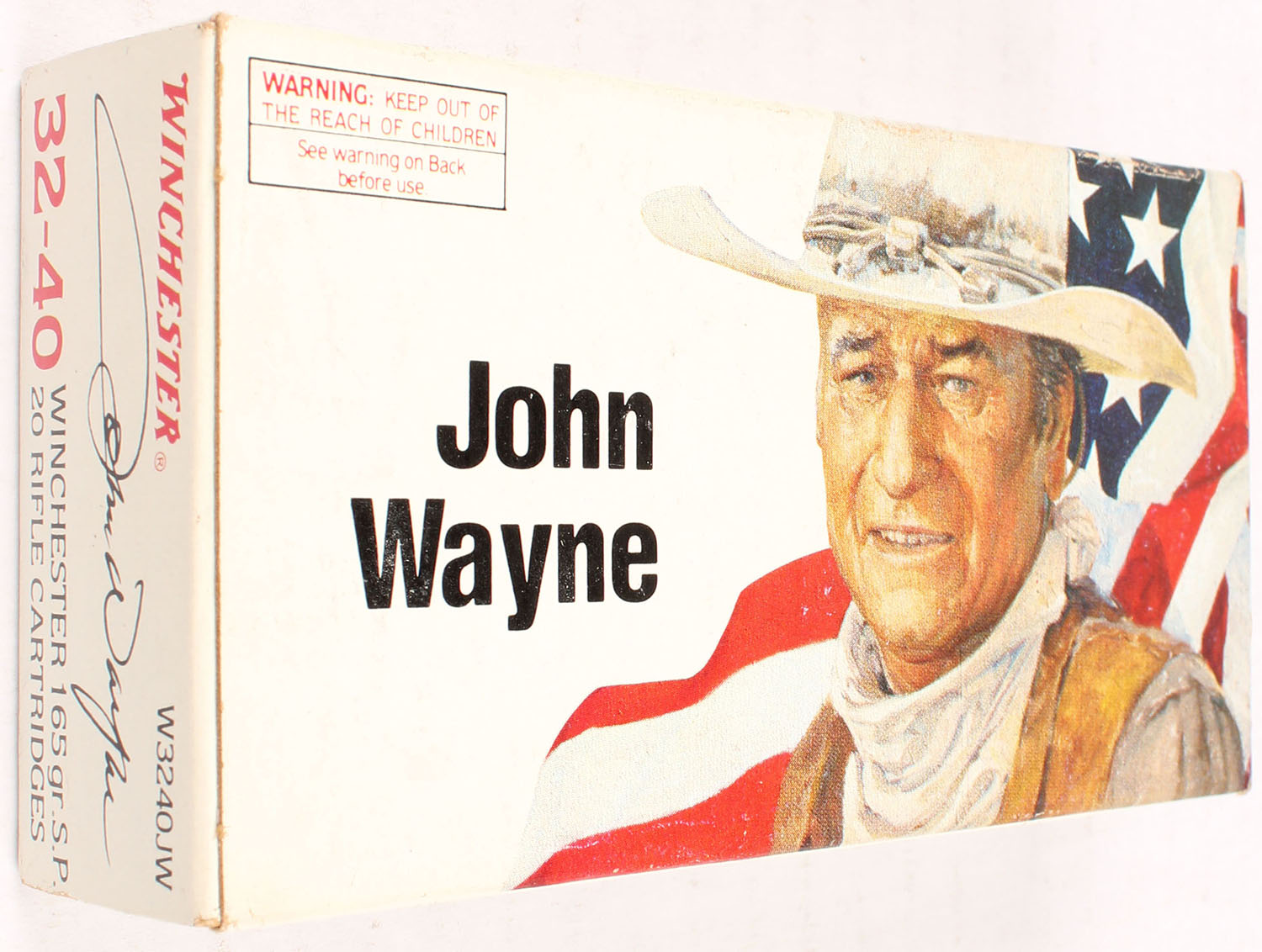 Winchester, John Wayne, .32-40 Winchester, 165 Grain Soft Point, Full, 1pc. White box featuring John Wayne, box is solid with excellent color, very minor shelf & corner wear, edges are crisp, end flaps are solid, ammo is minty. Grade: Excellent + - Value: 40 to 120