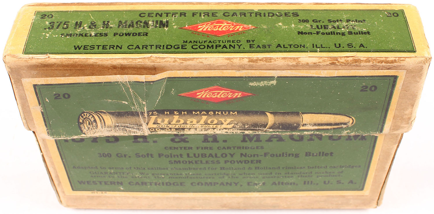 Western, Lubaloy, .375 H&H Magnum, 300 Grain Soft Point Lubaloy Non-Fouling Bullet, Smokeless Powder, Full, 2pc. Buff box with green & yellow labels, box is solid with very good to excellent color, some age soiling & shelf wear, some edge & corner wear, labels are intact, ammo is very good to excellent. Grade: Very Good ++ - Value: 50 to 150