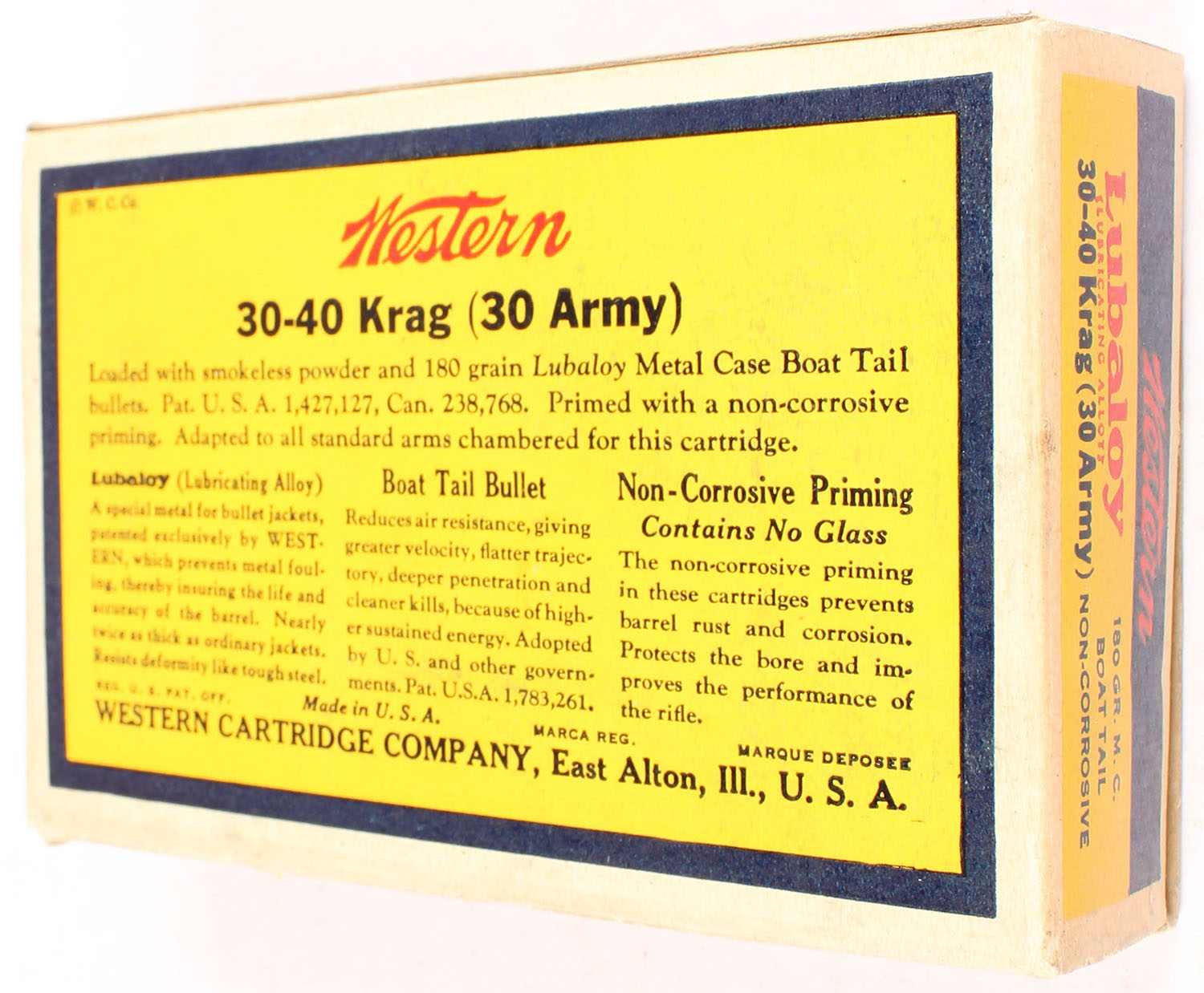 Western, Lubaloy, .30-40 Krag (.30 Army), 180 Grain Metal Case Boat Tail Bullet, Full, 1pc. Blue yellow & red bulls eye box, box is solid with excellent color, very minor age soiling & color bleeding, very minor corner wear, edges are crisp, end flaps are solid, ammo is excellent. Grade: Excellent - Value: 20 to 60