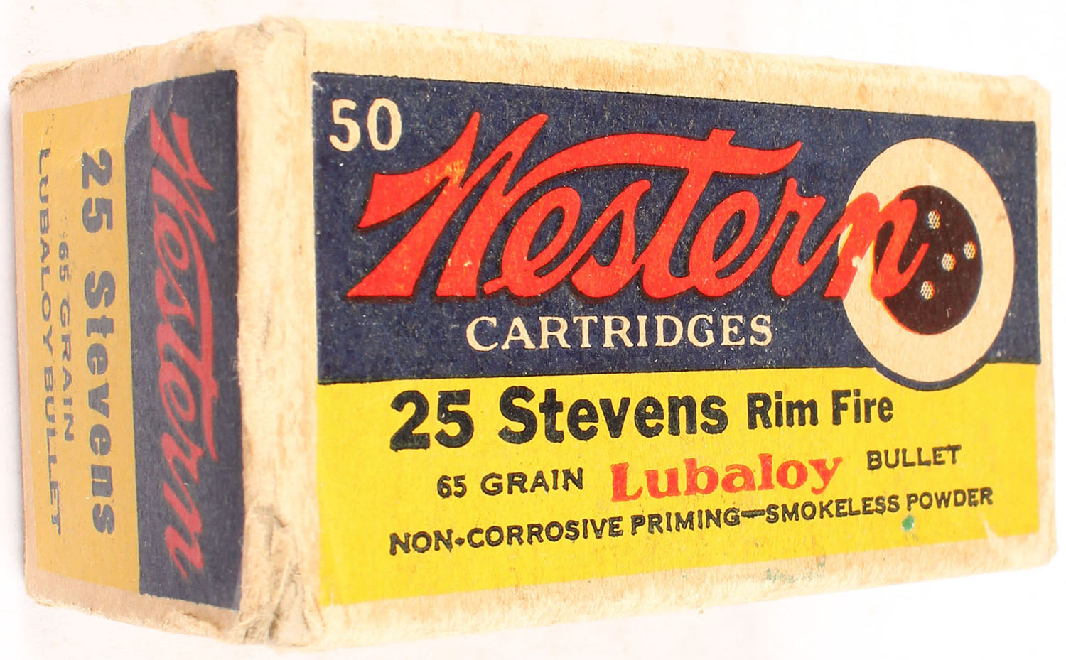 Western, Lubaloy, .25 Stevens Rim Fire, 65 Grain Lubaloy Bullet, Partial 48rds., 1pc. Blue yellow & red bulls eye box, box is solid with very good color, some age soiling, corner wear, minor edge wear, end flaps are solid, ammo is excellent. Grade: Very Good ++ - Value: 40 to 120