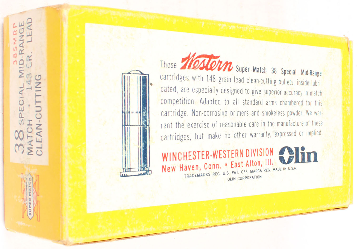 Western, Super-Match, .38 Special Mid-Range, 148 Grain Lead Clean-Cutting, Full of mixed H/S, 1pc. Yellow white & red box, box is solid with good to very good color, shelf wear, minor edge & corner wear, end flaps are solid, ammo is excellent. Grade: Very Good + - Value: 10 to 50