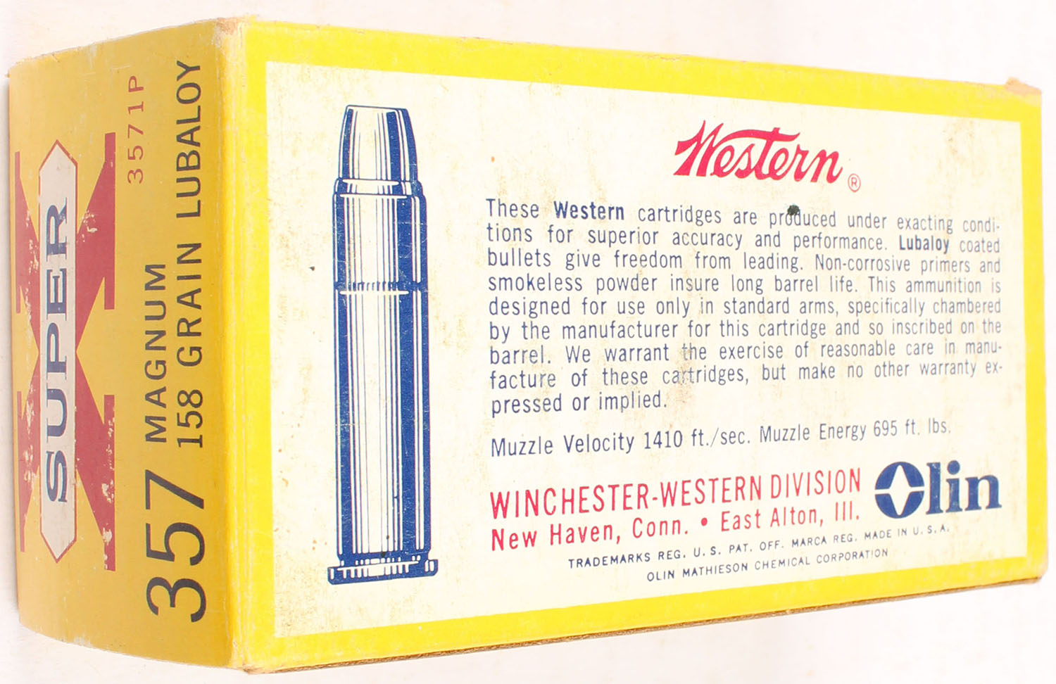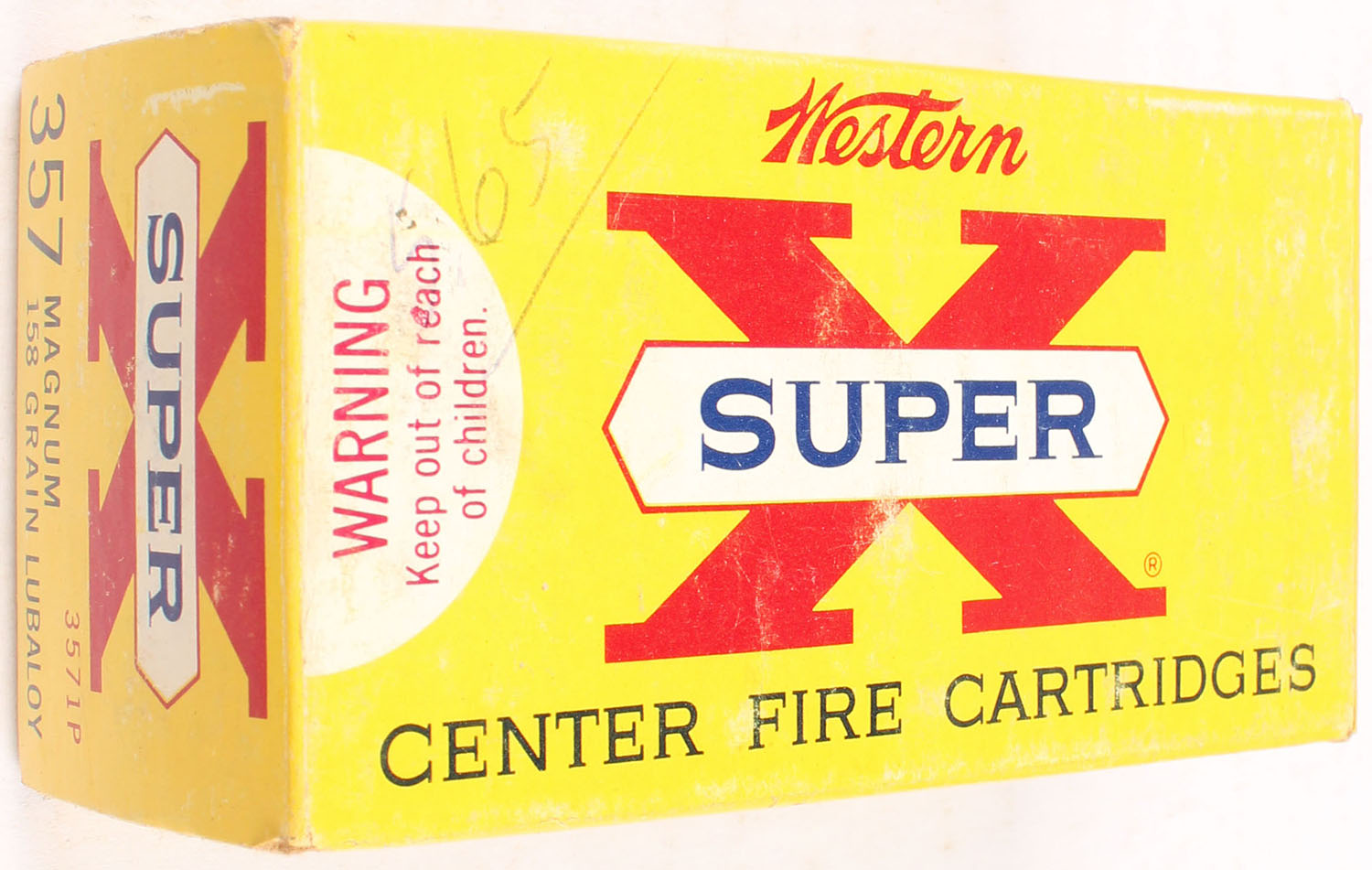 Western, Super X, .357 Magnum, 158 Grain Lubaloy, Full, 1pc. Yellow white & red box, box is solid with excellent color, minor shelf wear, corners are mostly sharp, edges are crisp, top has been written on, end flaps are solid, ammo is excellent. Grade: Excellent - Value: 20 to 60