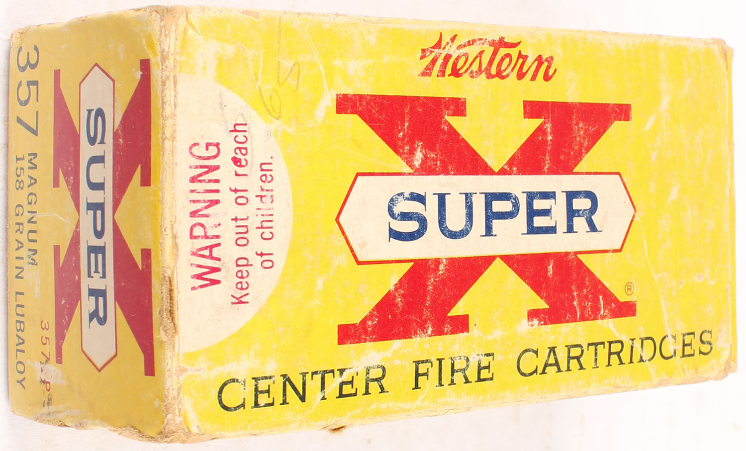 Western, Super X, .357 Magnum, 158 Grain Lubaloy, Full, 1pc. Yellow white & red box, box is solid with very good color, some shelf wear, edge & corner wear, end flaps are solid, top has been written on, ammo is excellent. Grade: Very Good - Value: 10 to 40