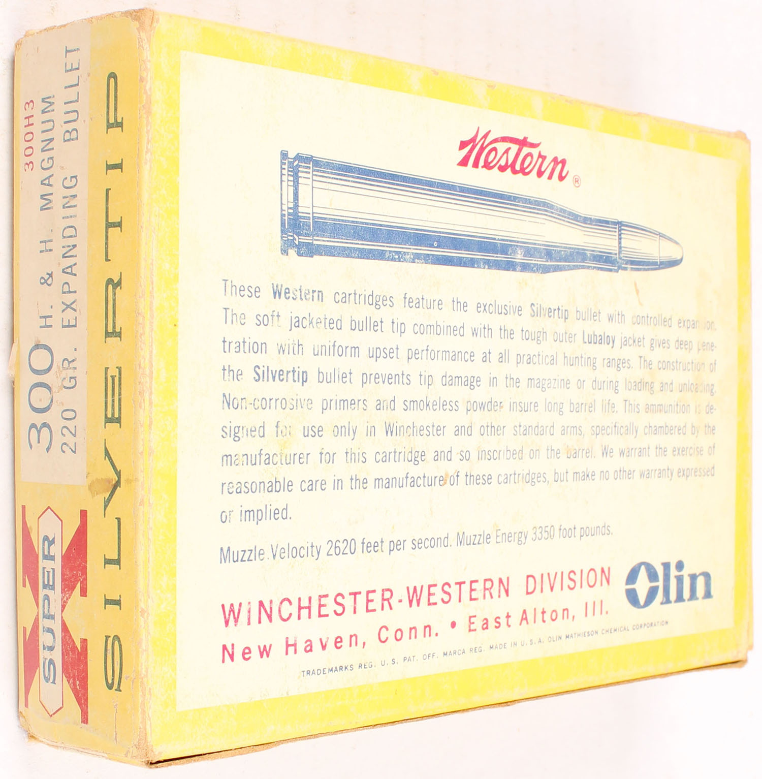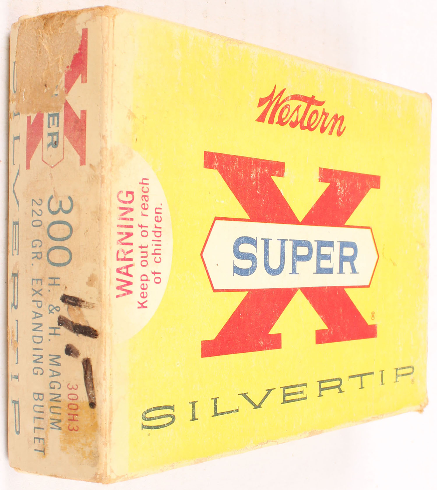 Western, Super X Silvertip, .300 H&H Magnum, 220 Grain Expanding Bullet, Full, 1pc. Yellow white & red box, box is solid with good color, some age soiling & color fading, some shelf wear, some edge & corner wear, end flaps are solid, ammo is excellent. Grade: Excellent - Value: 20 to 80