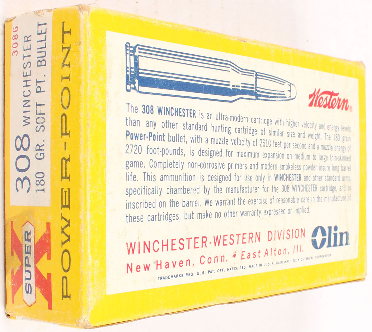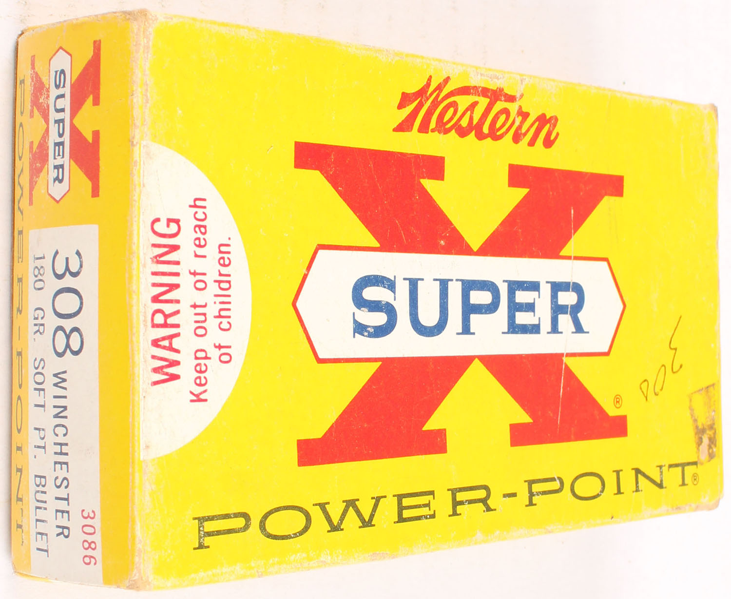 Western, Super X Power-Point, .308 Winchester, 180 Grain Soft Point Bullet, Full, 1pc. Yellow white & red box, box is solid with excellent color, minor shelf wear, tape stain on right end, top has been written on, minor edge & corner wear, end flaps are solid, ammo is excellent. Grade: Very Good ++ - Value: 10 to 40
