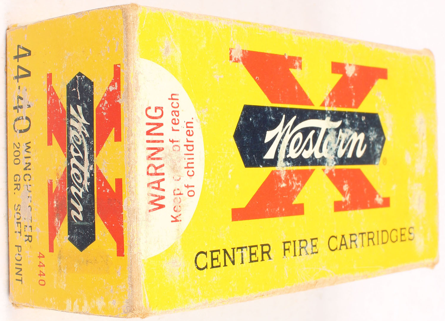 Western, X, .44-40 Winchester, 200 Grain Soft Point, Full, 1pc. Yellow white & red box, box is solid with very good color, shelf wear, minor age soiling, some edge & corner wear, end flaps are solid, ammo is excellent. Grade: Very Good + - Value: 100 to 300