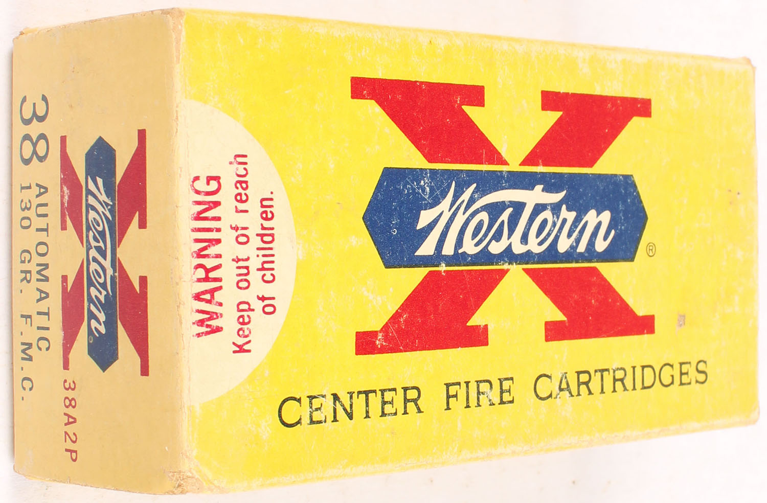 Western, X, .38 Automatic, 130 Grain Full Metal Case, Full, 1pc. Yellow white & red box, box is solid with very good color, minor age soiling, some color fading, very minor shelf & edge wear, minor corner wear, end flaps are solid, ammo is excellent. Grade: Very Good ++ - Value: 20 to 60